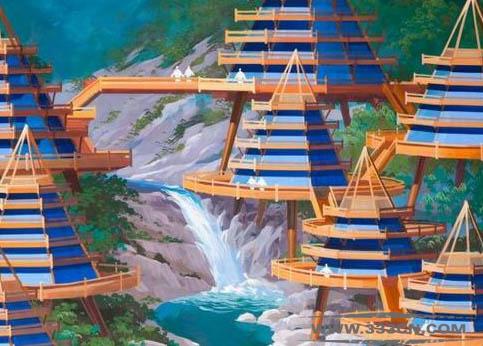 這批效果圖展示了建筑師對未來朝鮮的一些居住以及出行還有產(chǎn)業(yè)的預(yù)想,包括了在朝鮮金剛山地區(qū),架設(shè)在瀑布周圍的度假別墅群的效果圖。在別墅內(nèi)部人們和諧的生活。這也許對于目前的朝鮮來說是難以想象的。