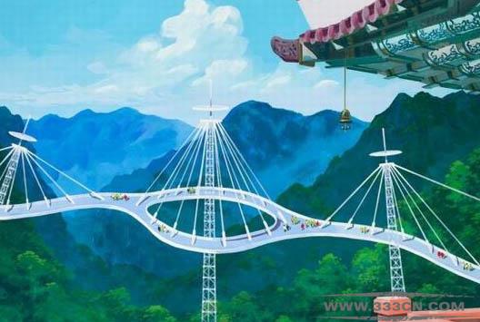 結(jié)合了舊式設(shè)計(jì)條件和新式設(shè)計(jì)理念,設(shè)計(jì)師還展示了連接在朝鮮妙香山各個(gè)山峰間的人行天橋。