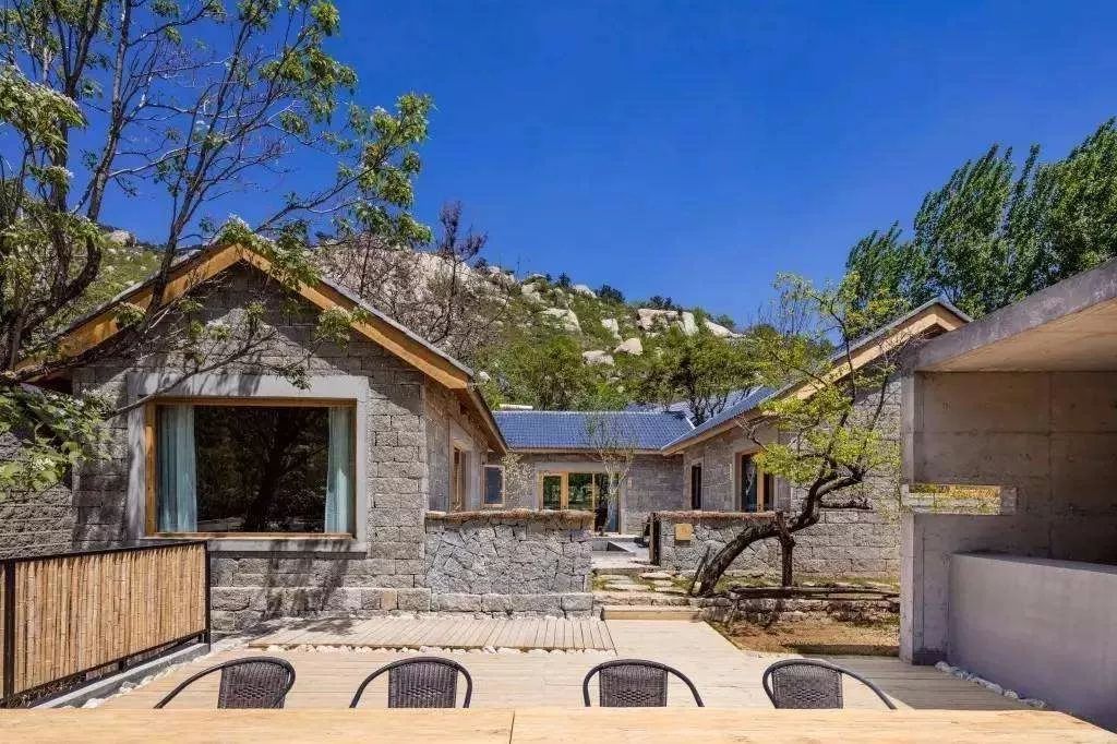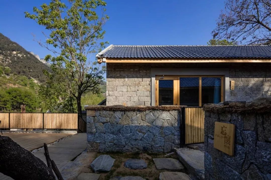 設計亮點:以石頭、老瓦、舊木、夯土、老磚這些簡單又令人懷念的的本土元素為主要設計元素,采用極簡的風格,院內景色與山景相襯相融,改造時保留每一棵老樹和每一塊石頭,將幾十年的牛棚和老房子改建成了5個不同主題——觀云、聽瀑、忘懷、自在、依山,營造“臥聽松嘯 伴山而眠”的生活意境。