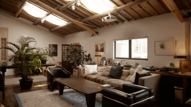 一個房間用作餐廳,另一個做客廳。屋頂開了兩扇天窗,自然光灑下,整個空間明亮通透。天窗下還吊了兩塊白布,避開夏天直射進屋里的烈日,光線也更加柔和。