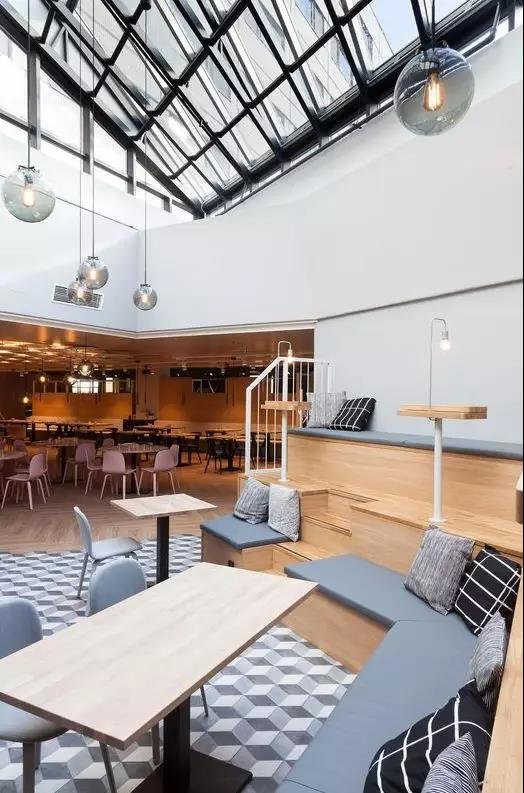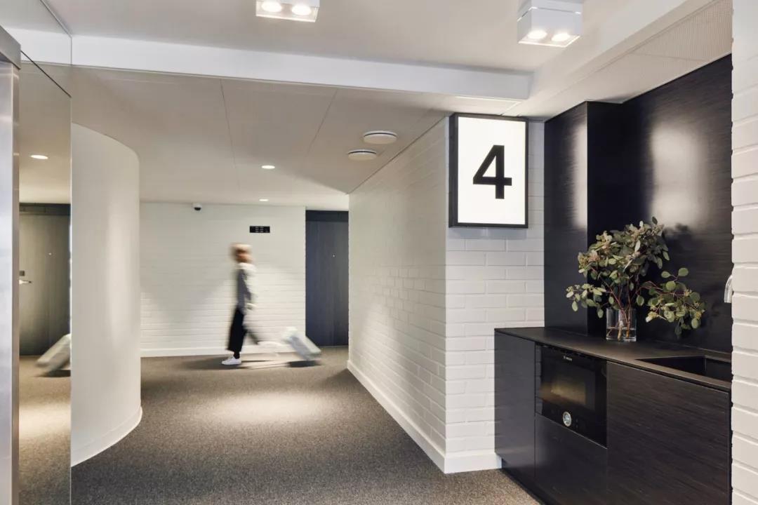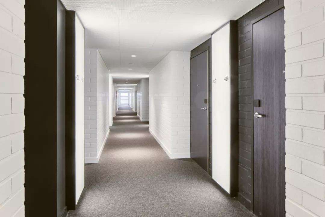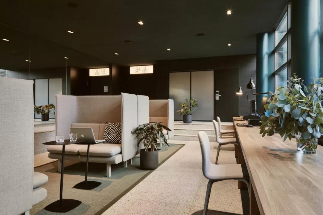 在工作區,舒適的展臺配有小型筆記本電腦桌,而窗戶旁邊還有一張長木桌。走廊的設計保持簡單,酒店的標牌由易辨認的象形圖組成。每層還設有一個帶微波爐和熱水龍頭的公用小廚房。
