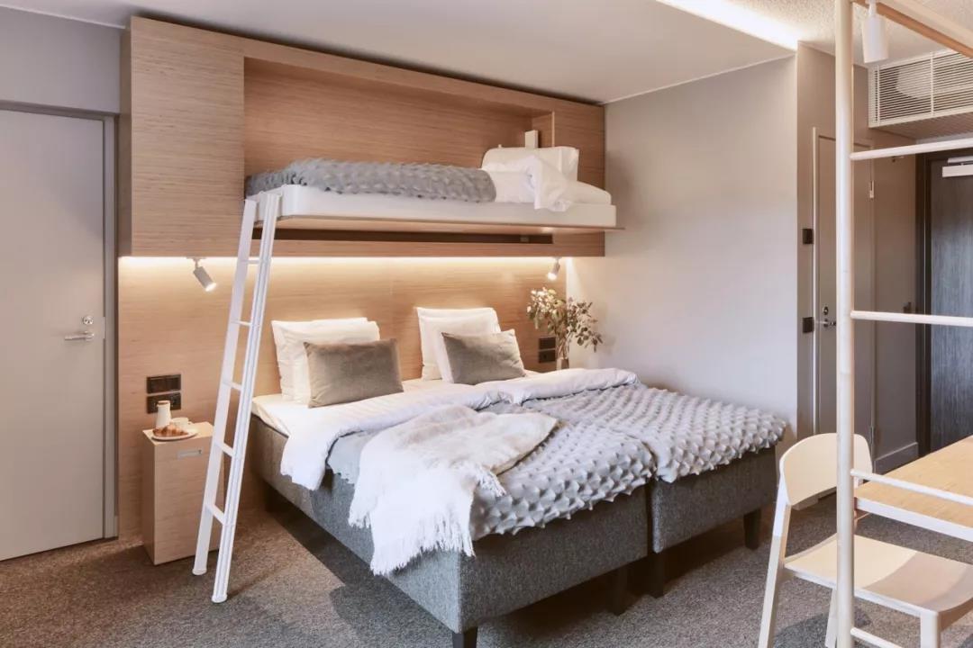 由于酒店的客人通常只停留一兩晚,而且團體的規模可能會有所不同,所以設計師在客房的內部設計了「隱藏式折疊床」,有很強的功能性,同時也節省了空間。