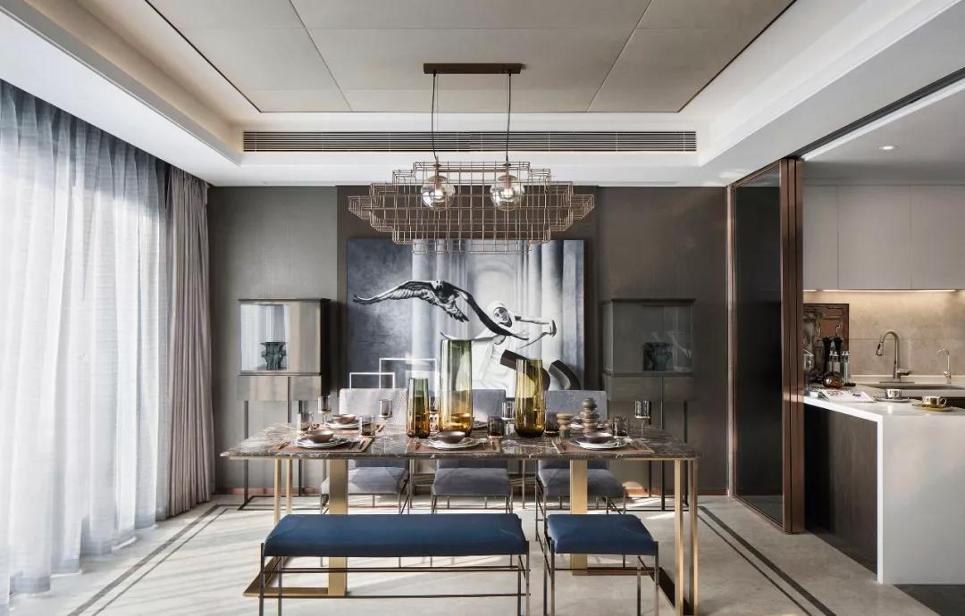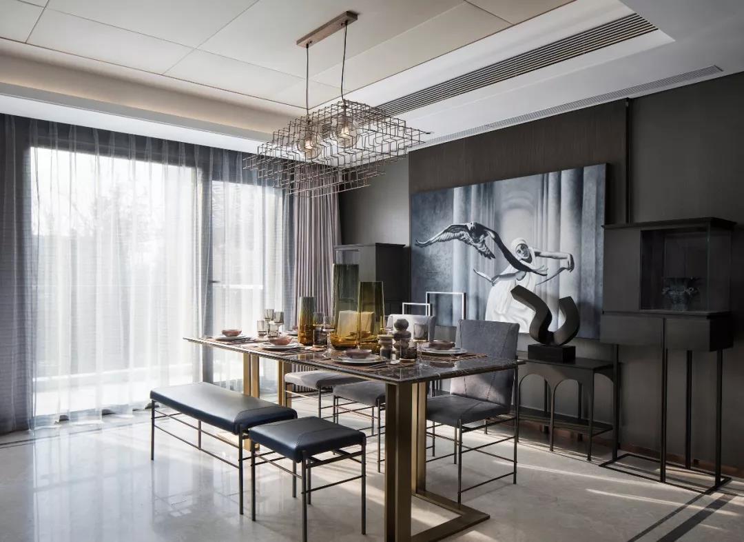 客廳與餐廳相連,自然光由通透的玻璃窗鋪灑進(jìn)來,為居室附上一層溫馨恬靜的光暈。后現(xiàn)代的藝術(shù)裝置與背景的裝飾畫互相呼應(yīng),幾何形制的家具,低調(diào)中彰顯著現(xiàn)代精英氣質(zhì)。