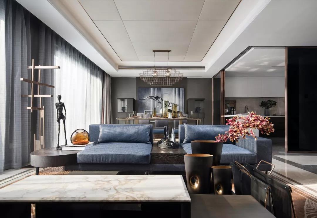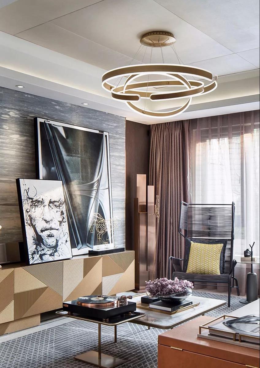 低飽和度的淺橙色與藍(lán)色之間有幽微的碰撞,別致的金屬異型吊燈,與家具的線條結(jié)構(gòu)相互呼應(yīng),營造出與眾不同的空間魅力,其中有溫暖的冷靜、個性的簡約。