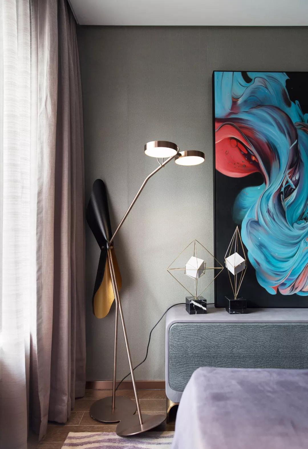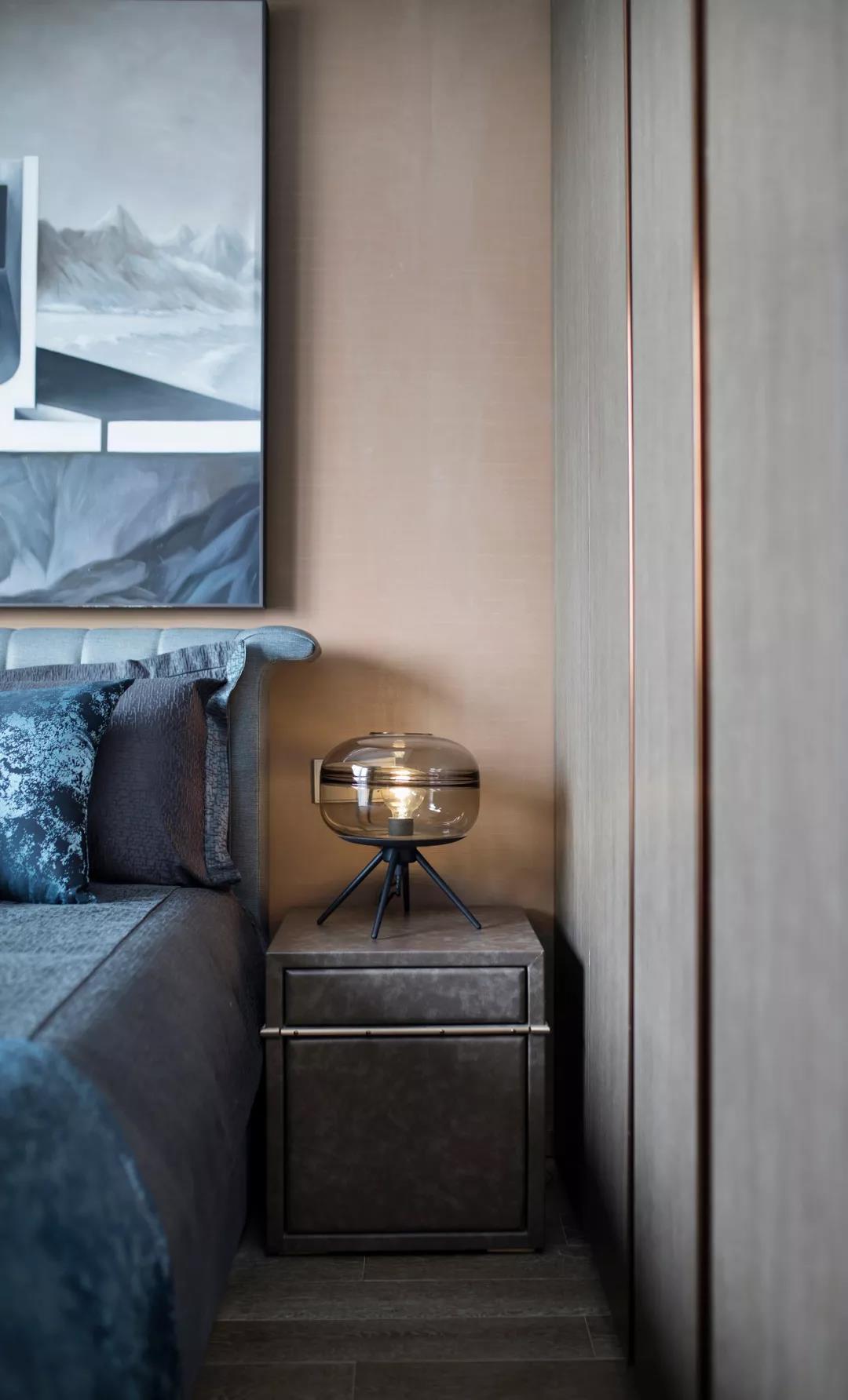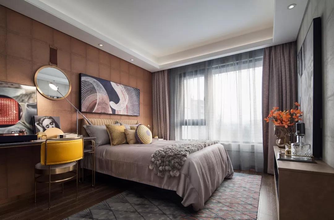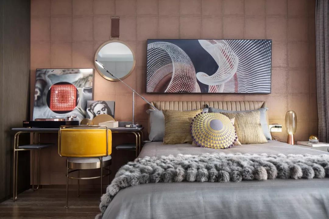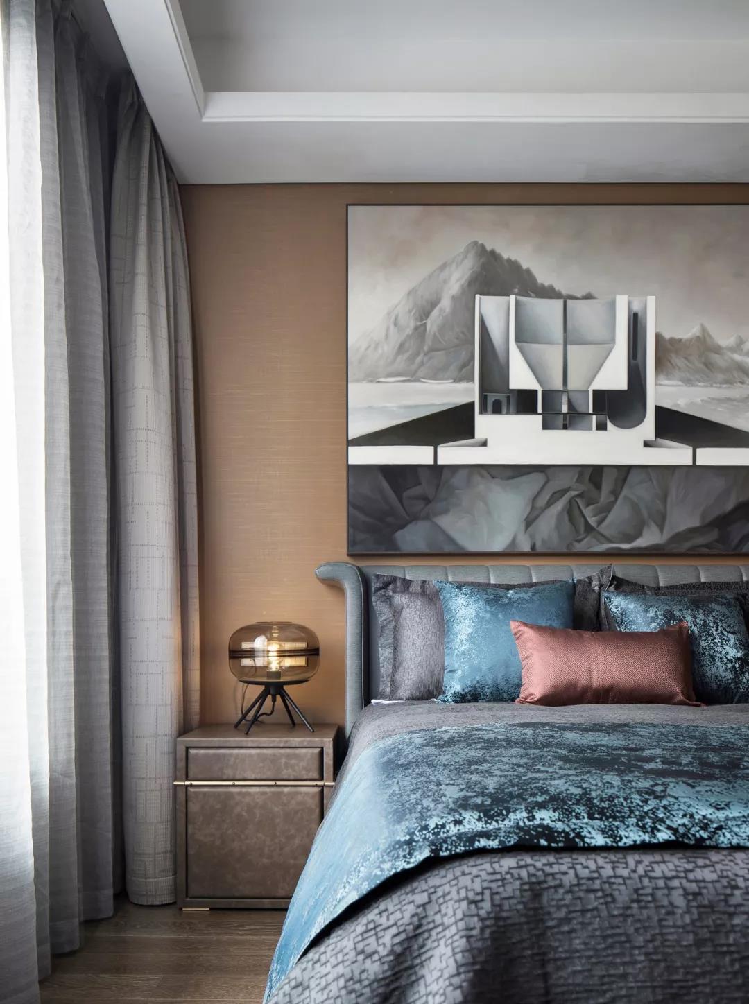 主臥設(shè)計(jì),中性偏暖的色調(diào)賦予空間曖昧多義的可能,軟裝床品散發(fā)出柔軟曼麗的味道。大幅裝飾畫帶有大氣粗獷的野性,彰顯出后現(xiàn)代的非連續(xù)性和多元化,讓空間充滿時尚、不羈的誘惑力。