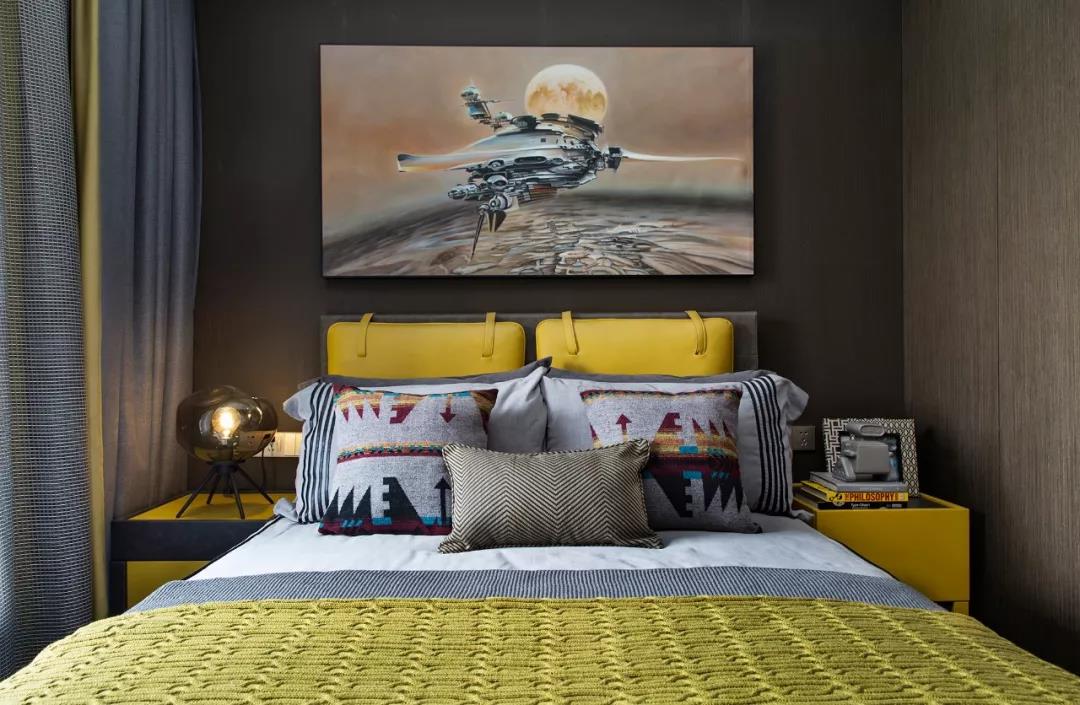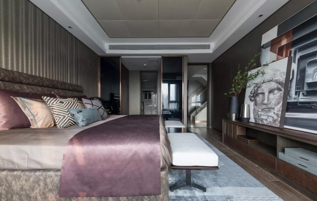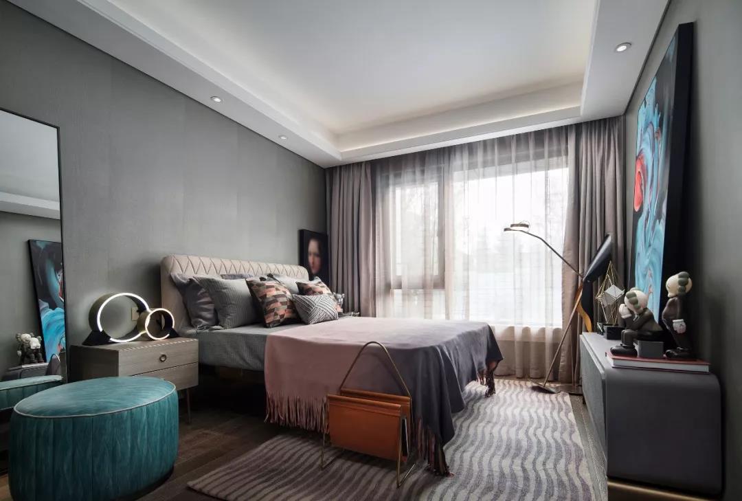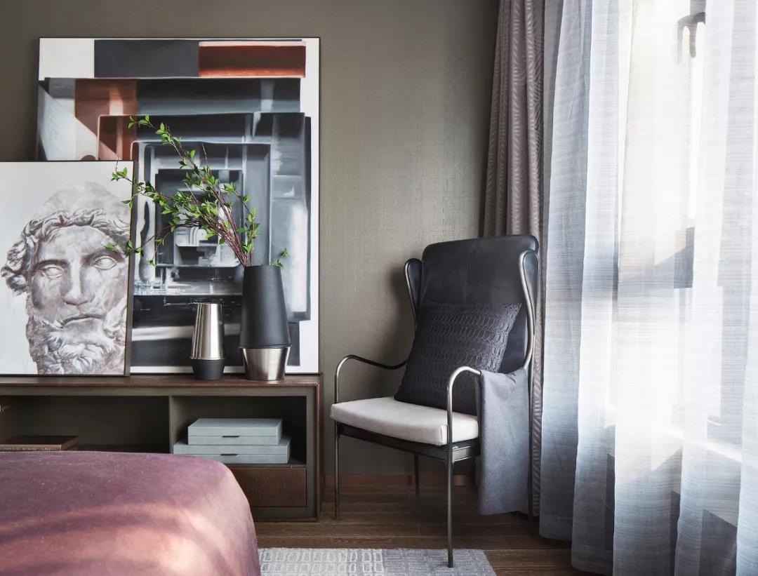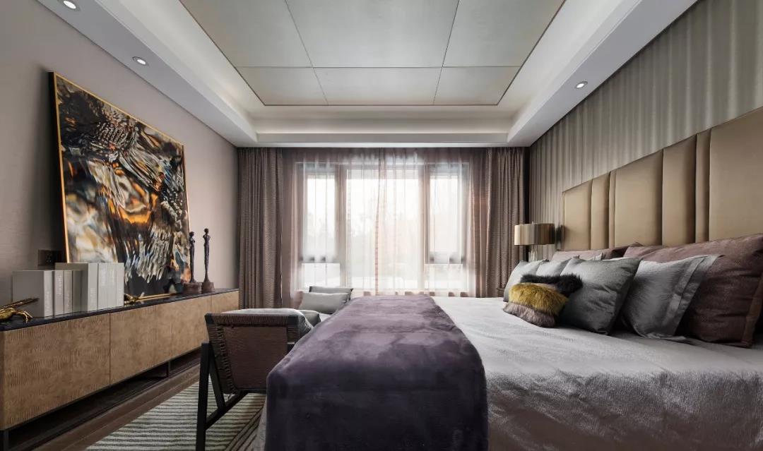 主臥設(shè)計(jì),中性偏暖的色調(diào)賦予空間曖昧多義的可能,軟裝床品散發(fā)出柔軟曼麗的味道。大幅裝飾畫帶有大氣粗獷的野性,彰顯出后現(xiàn)代的非連續(xù)性和多元化,讓空間充滿時尚、不羈的誘惑力。