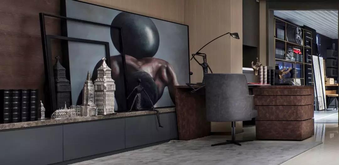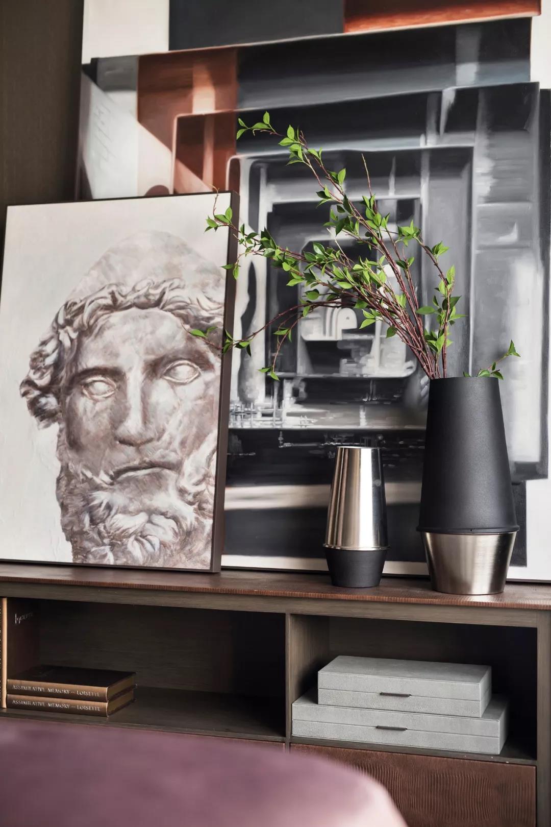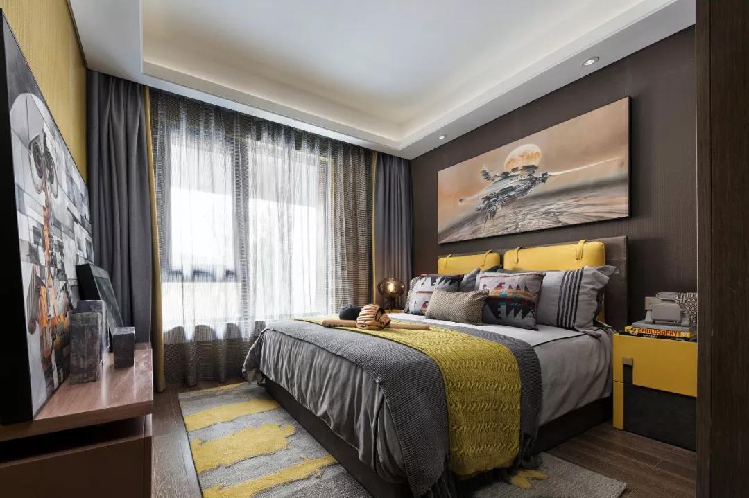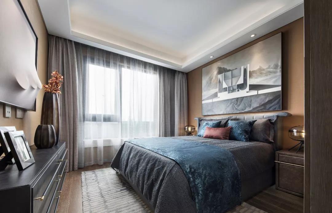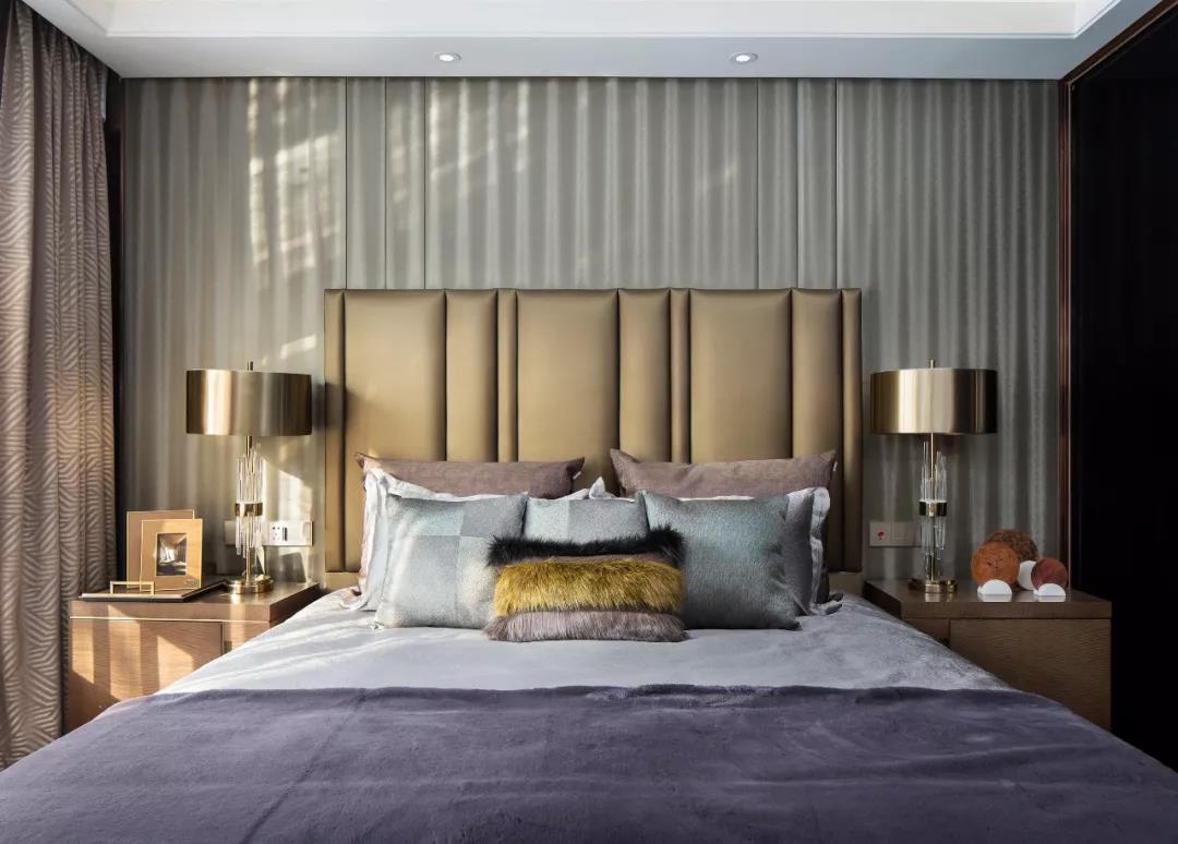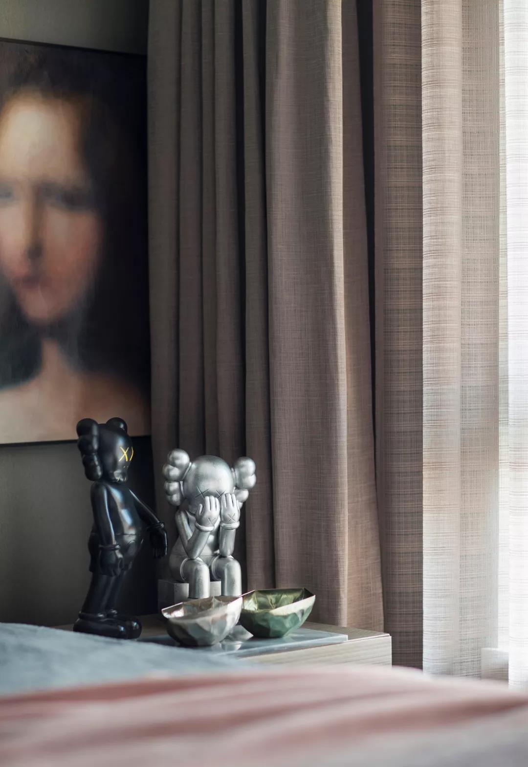 主臥設(shè)計(jì),中性偏暖的色調(diào)賦予空間曖昧多義的可能,軟裝床品散發(fā)出柔軟曼麗的味道。大幅裝飾畫帶有大氣粗獷的野性,彰顯出后現(xiàn)代的非連續(xù)性和多元化,讓空間充滿時尚、不羈的誘惑力。