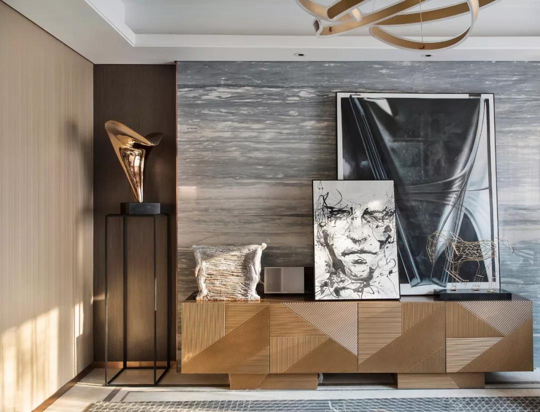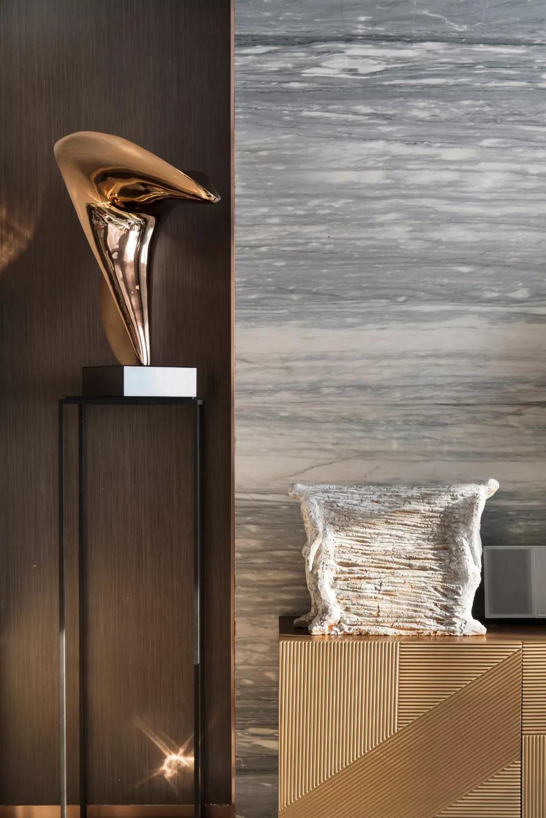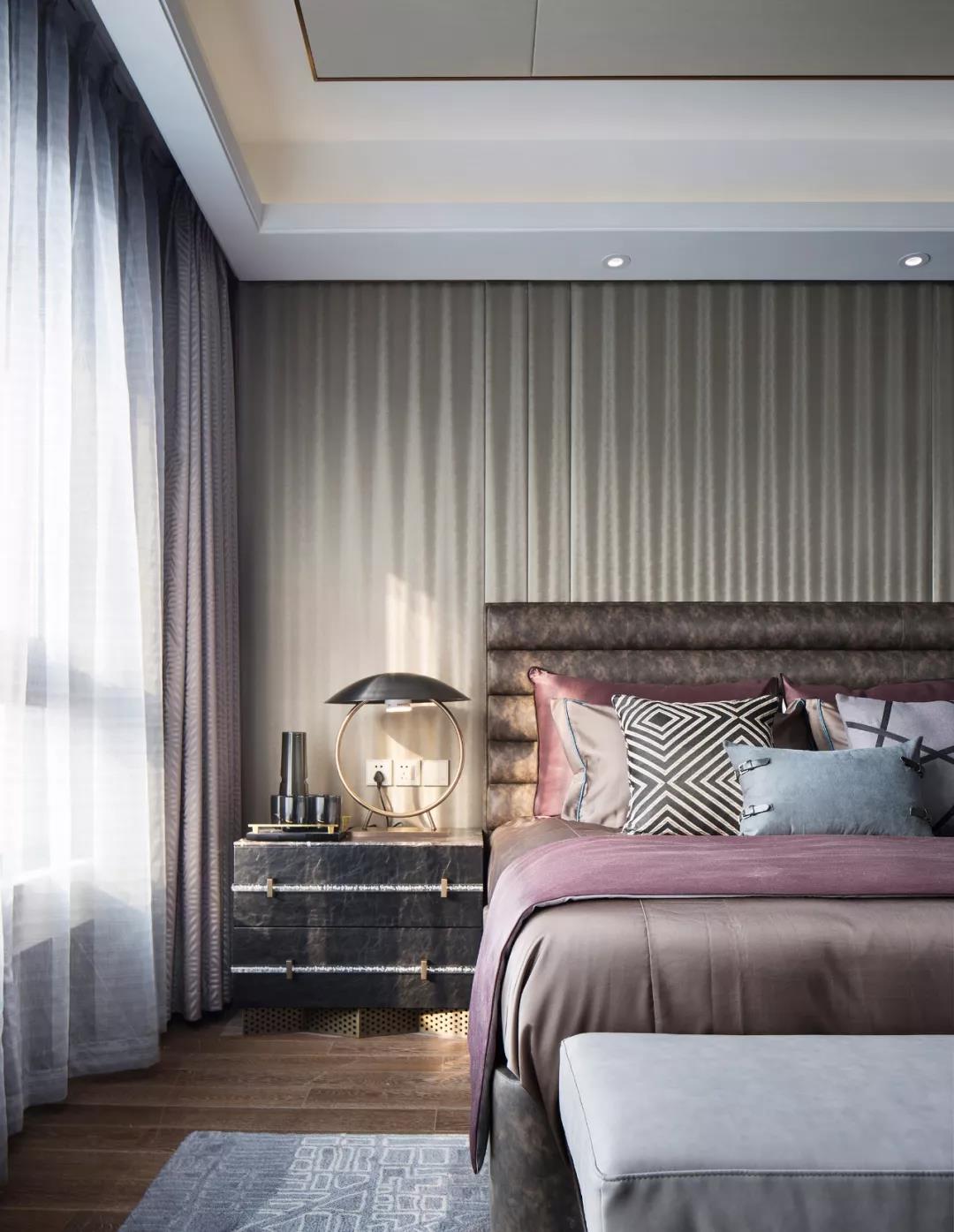 主臥設(shè)計(jì)體現(xiàn)了優(yōu)雅的藝術(shù)品位,整體空間層次豐富且有序,具象和抽象的交織扭結(jié),碰撞出嶄新的空間想象,在嚴(yán)謹(jǐn)理性中涂抹上輕松瀟逸的一筆。
