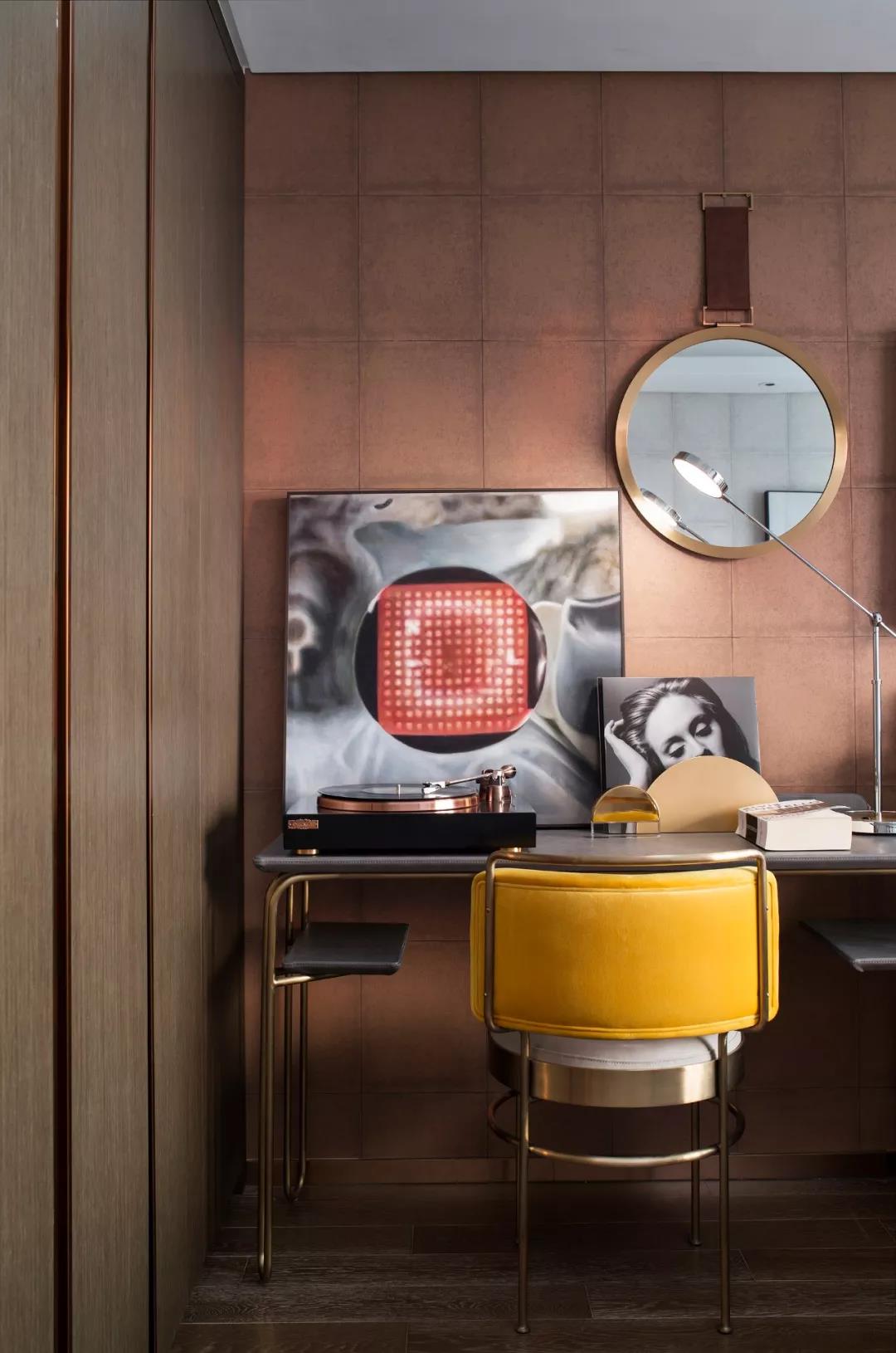 女兒房設(shè)計(jì)中,墻上的圓形銅鏡與背景墻完美契合,同時又因其獨(dú)立的個性色彩賦予空間新的審美視角,床頭的裝飾畫與床品的紋飾存在某種潛在的呼應(yīng),生動的精神氣韻交相流動。