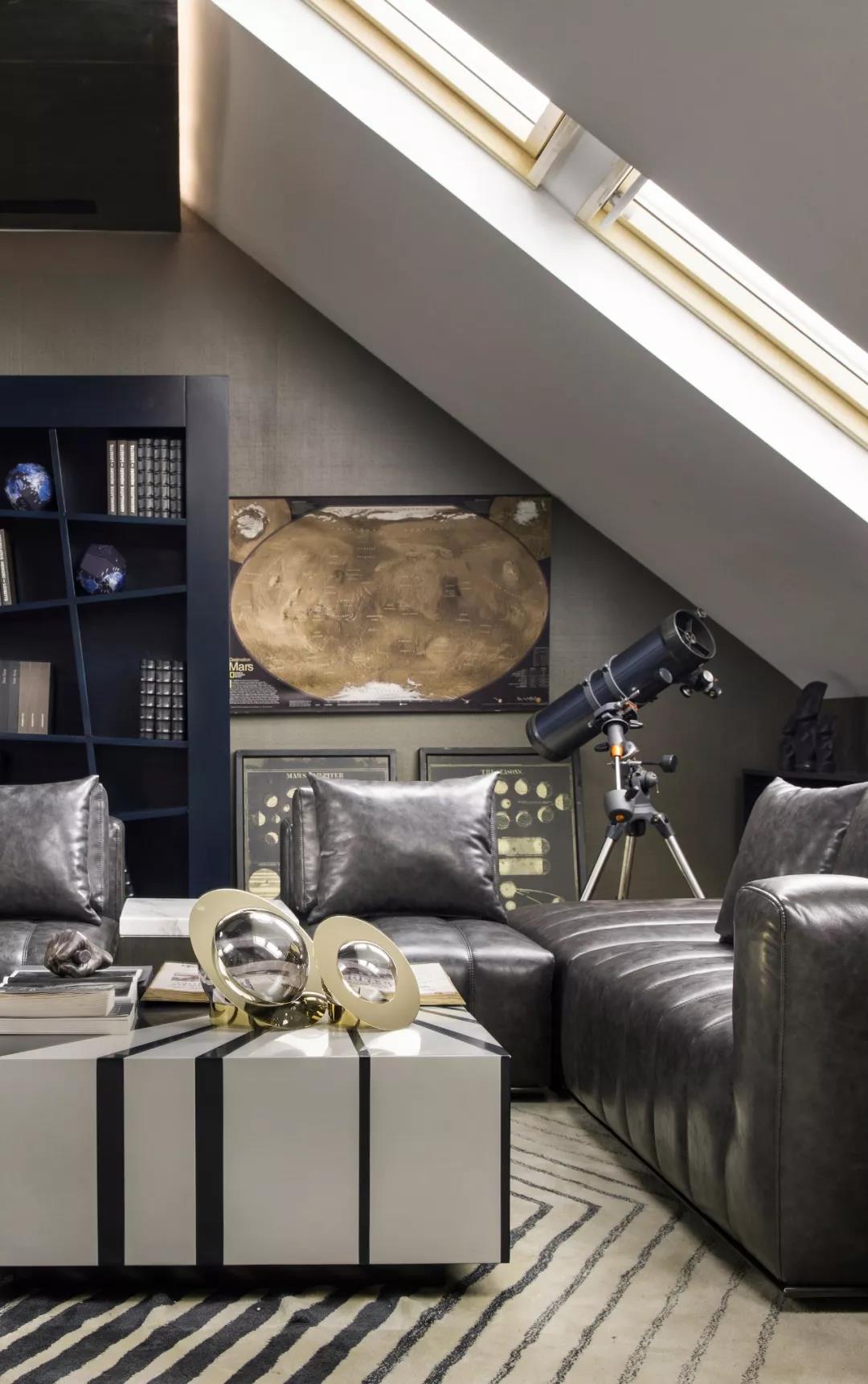 閣樓空間,可以承載更隨性更個性化的功能需求。黑色統(tǒng)籌空間,皮革面料展現(xiàn)出不羈與一絲野性,彰顯出新朋克風(fēng)的性感和獨(dú)特韻味。