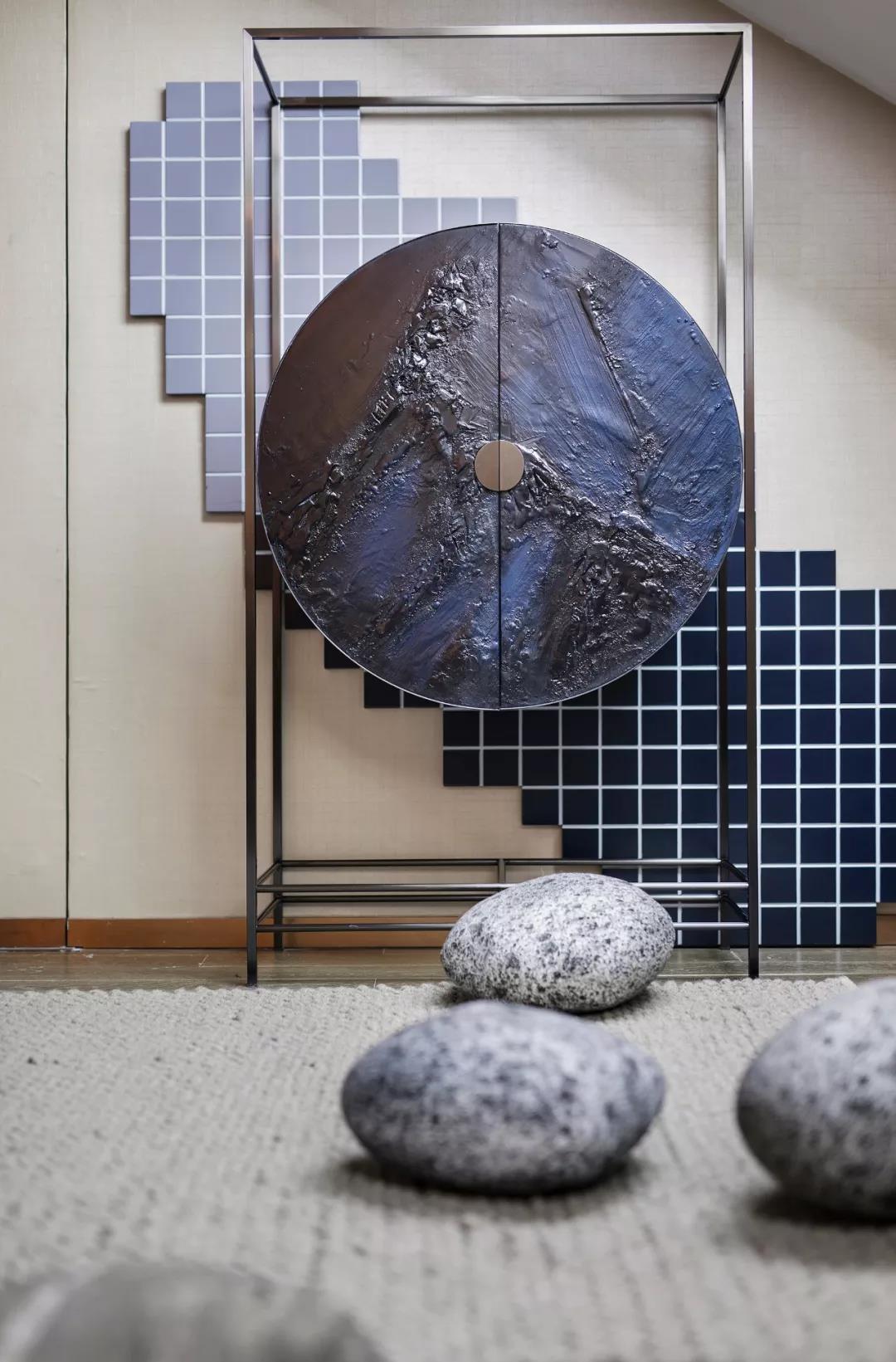 空間主調(diào)為女性氣質(zhì)的溫柔感,而一副充滿張力的油畫,在藍(lán)色顏料的縱情揮灑中,時而卷帶起一縷曼妙妖嬈的紅,再度讓空間突破常規(guī)的溫馨恬靜,走向更高的空間審美場域。