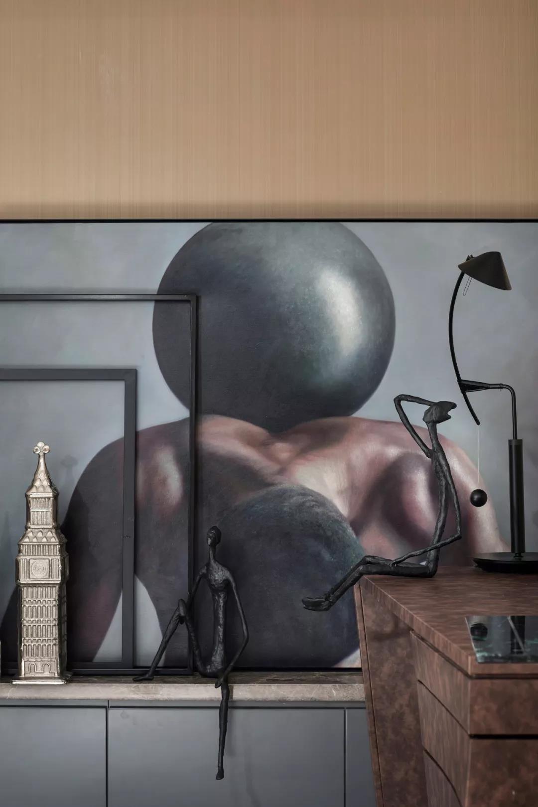 次臥設(shè)計(jì),在兼顧安放好沉穩(wěn)、安靜的主基調(diào)后,賦予空間更多的美學(xué)意味,超現(xiàn)實(shí)主義繪畫悄然打破了空間的沉悶感,讓原本稍顯黯然的軟裝飾品也蒙上一層神秘而富于想象的意味。