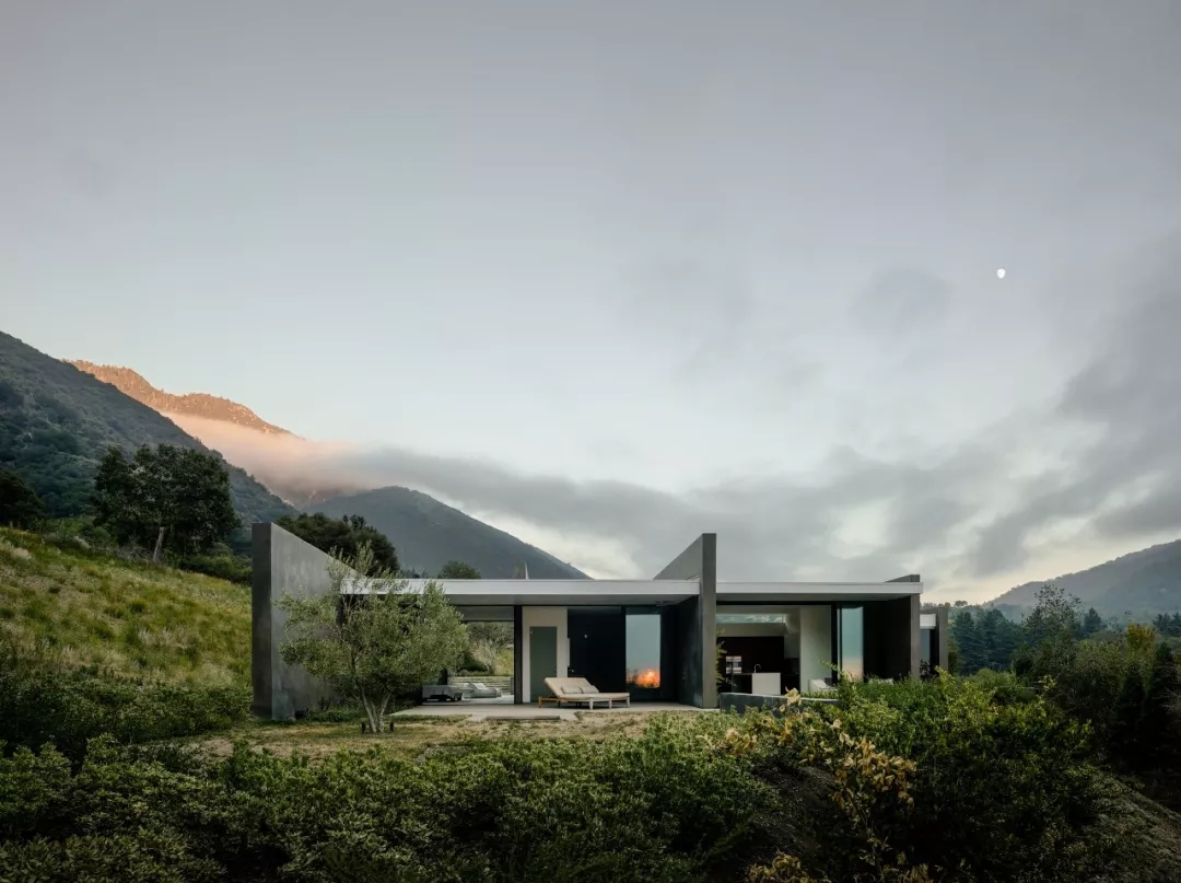 這棟別墅位于美國圣貝納迪諾國家森林山腳下,約300平方米, 該設(shè)計采用了加厚的墻壁,厚重而樸質(zhì)的墻壁沿著山脈的地形向東西方向延伸,防止室內(nèi)受到強烈陽光的照射。