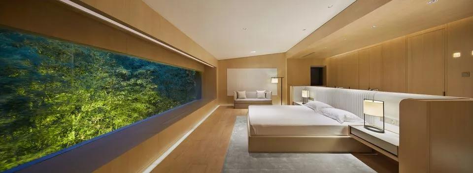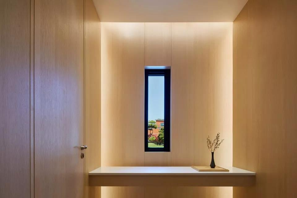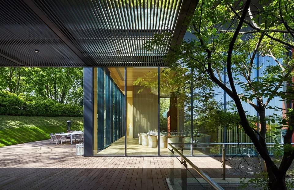 一個空間的氣質與韻味,從項目的選址那一刻就已經隱含在場地的血脈里了。不知道是先有環境還是先有建筑,建筑的西、北兩面的綠化非常好,而設計師在這兩面并未替這棟建筑開窗,客觀上就形成了建筑與現有環境的疏離。所以我們第一個念頭就是把它打開,克服設計和施工上的操作難度,大膽地采用了遠超正常尺寸的特制大尺寸中空玻璃。13塊玻璃形成了13幅巨畫,把外面的風景像畫卷一樣在我們面前展開,不同時間段不同的光影效果,實際上使得后期呈現的動態的畫面遠遠超過13幅。無論是草長鶯飛二月天,還是陰陰夏木囀黃鸝,又抑或是夜深風竹敲秋韻乃至山意沖寒欲放梅,都成為室內生活水******融的共同體。