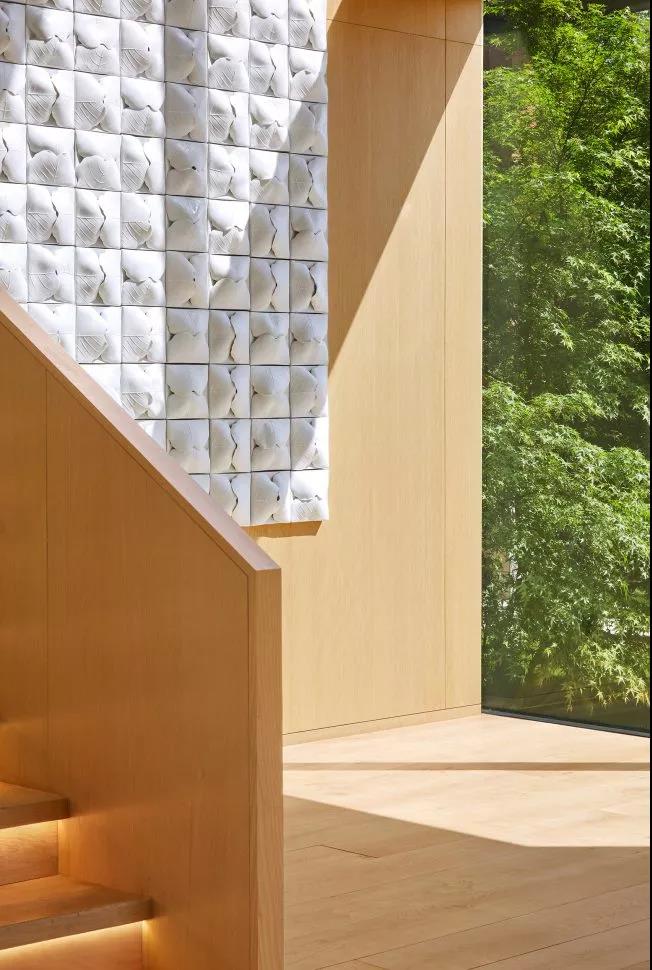 ▼大片落地窗,木制樓梯和植物主題裝飾板