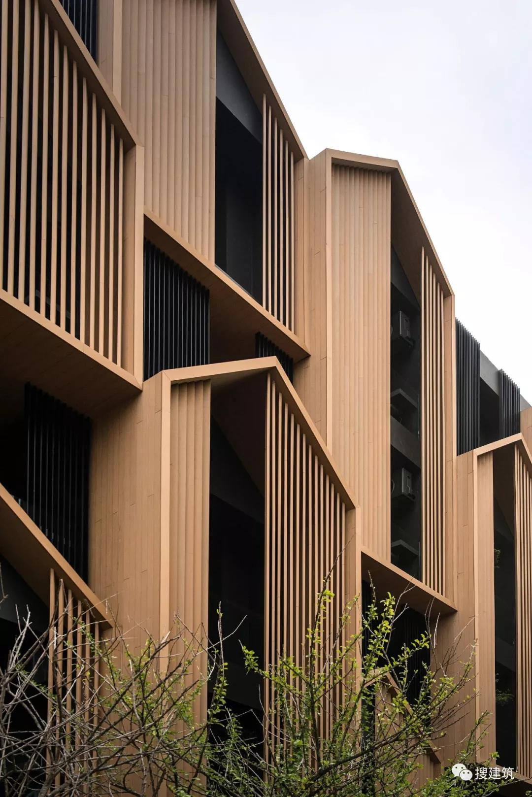 The building composes of several modular gable stories, each of them is orderly differentiated, including different depth, lath orientation and height. With a perfect combination of those modules that makes them like harmony rhythm as if the building is a vertical village.