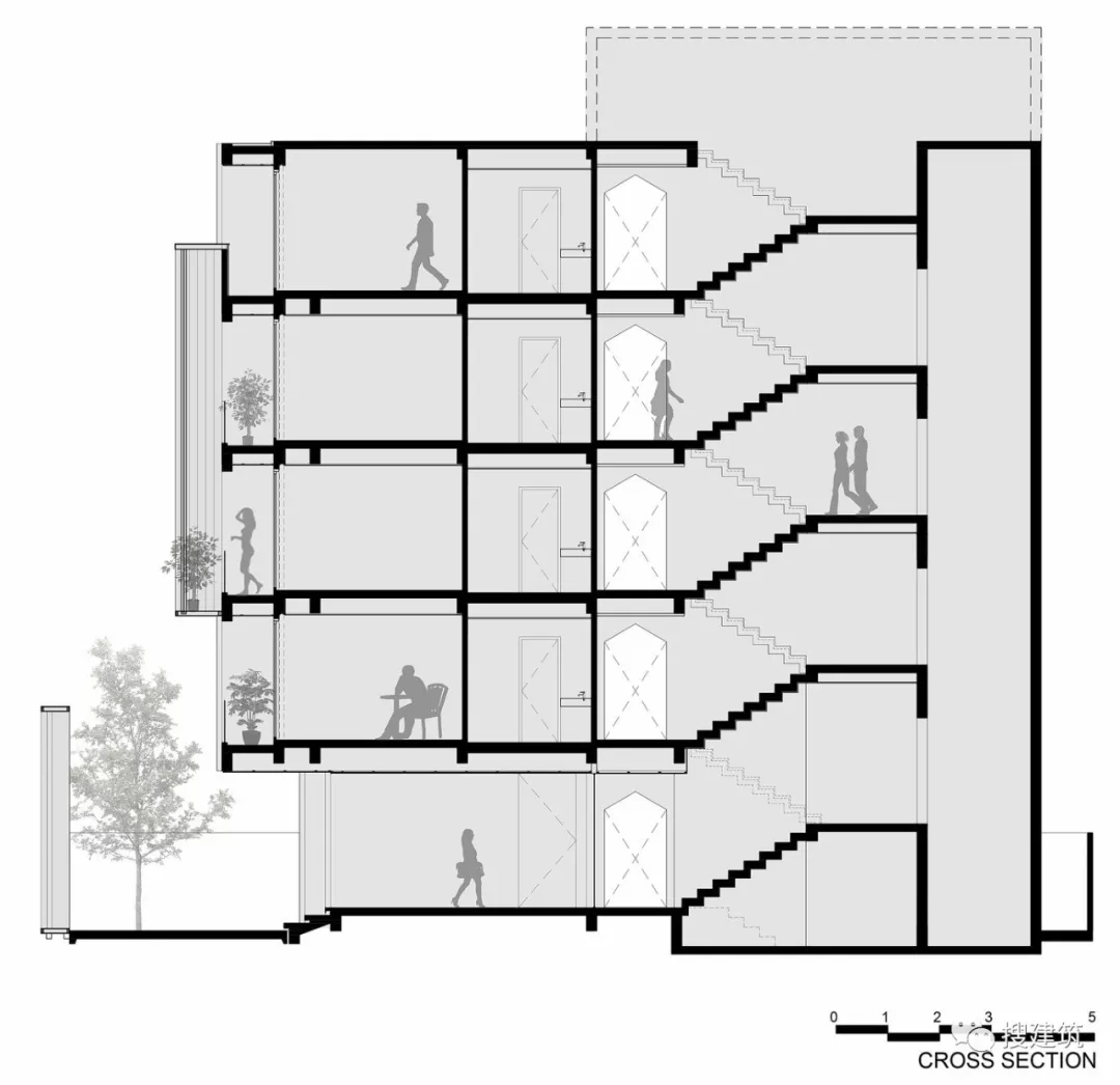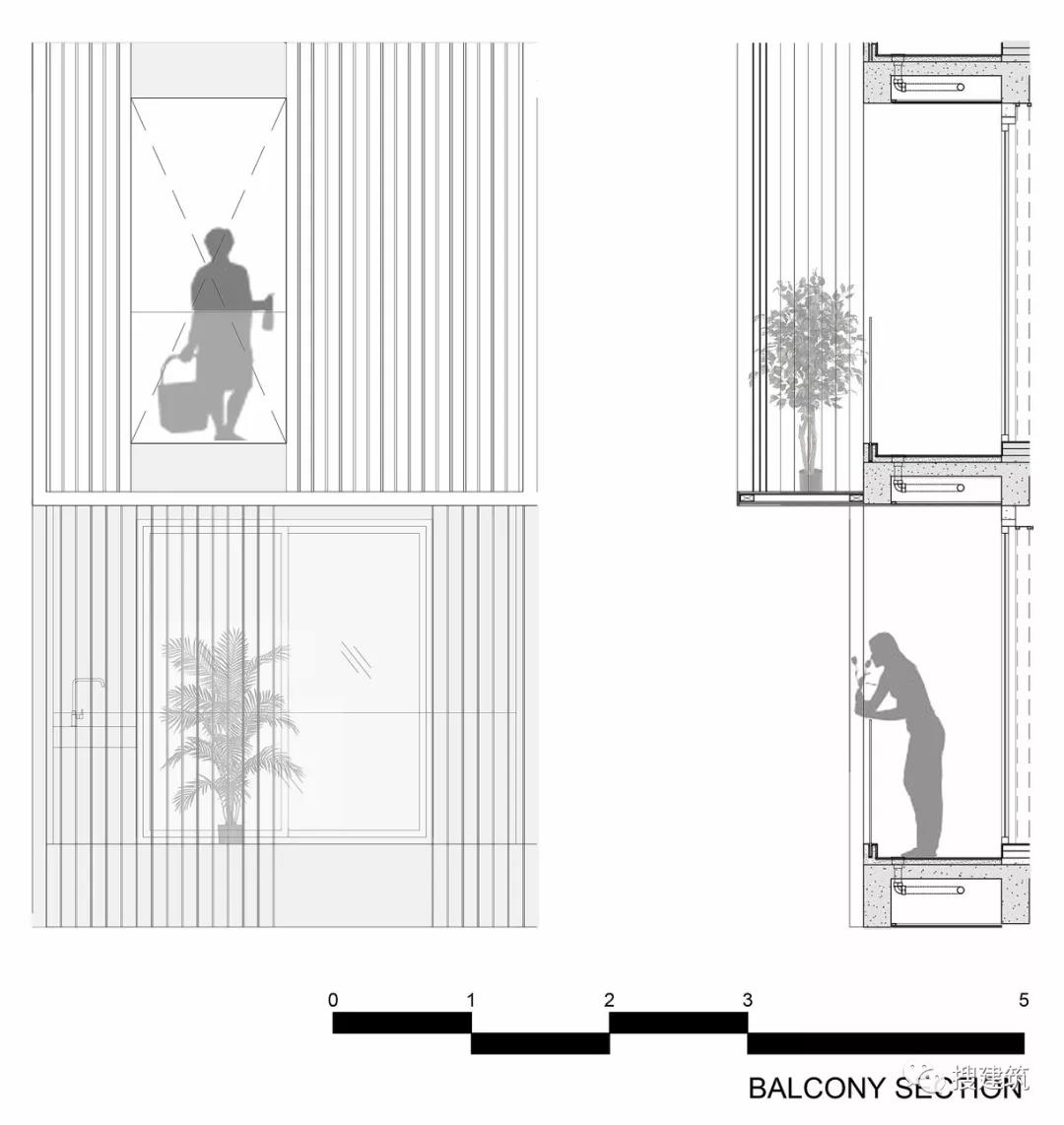 在傳統公寓的設計基礎上,創造了一個堅固的盒子作為模型,外部由幾個陽臺組成,這些陽臺主要目的就是用來晾衣服。在每個陽臺上設計山墻,隱藏不整潔的陽臺,并在白天成為遮陽傘,讓租戶感覺公寓就是他們的家。