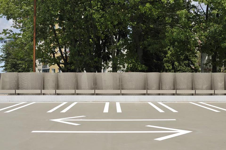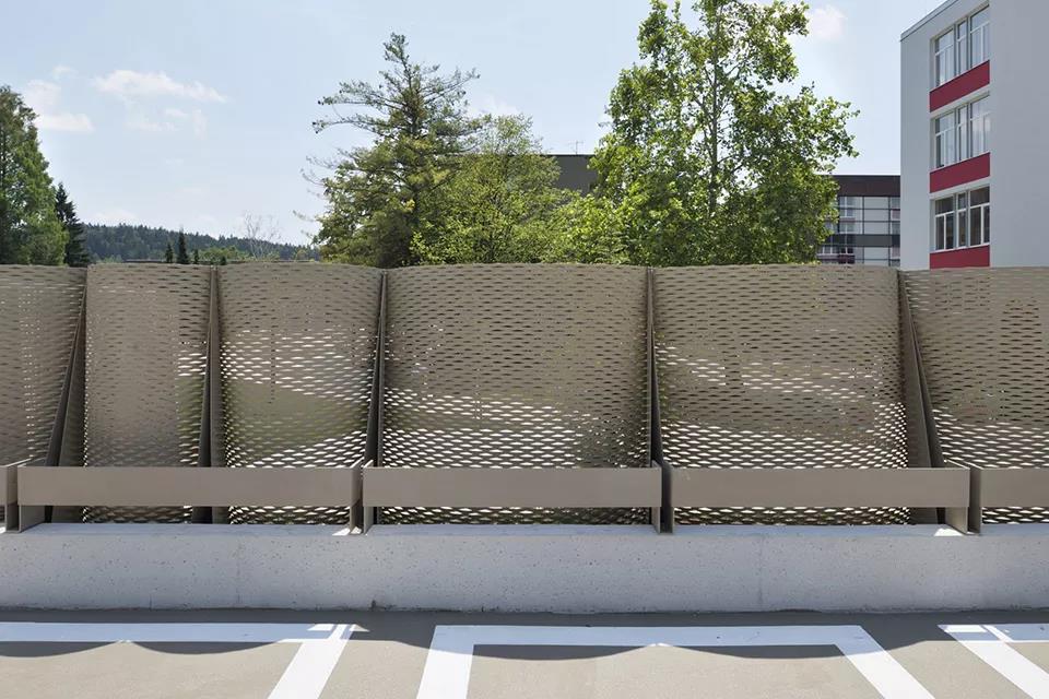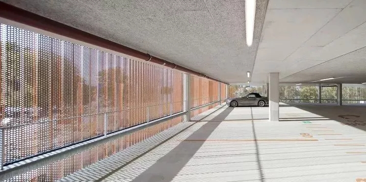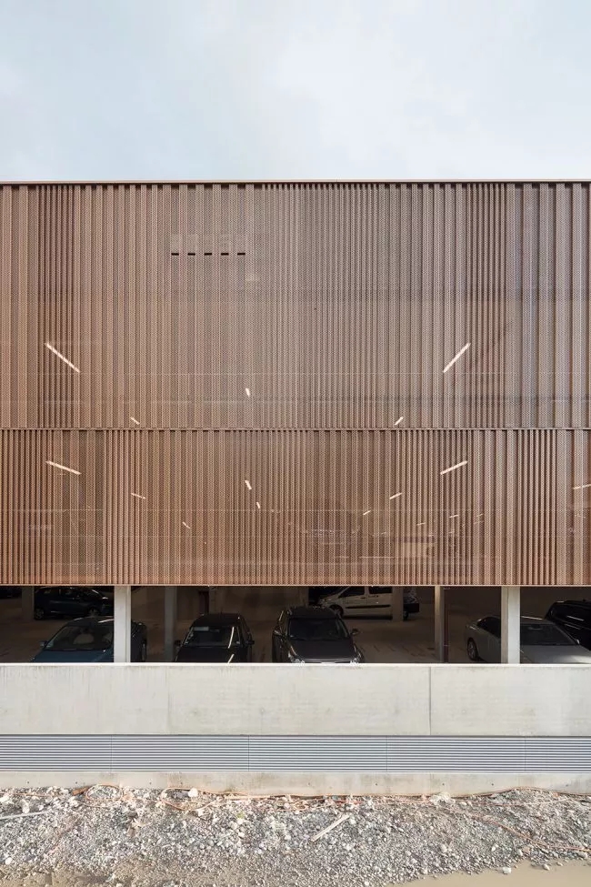 地上停車(chē)的空間外圍被一層輕質(zhì)的金屬外表皮遮蔽