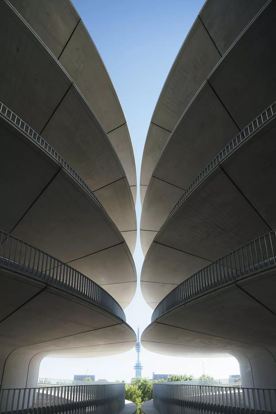 巨大的預(yù)制混凝土構(gòu)件將螺旋塔樓與主體停車(chē)場(chǎng)相連接