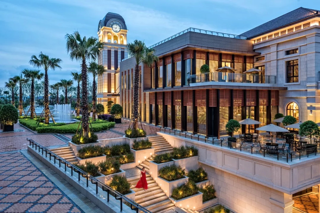 新古典主義風格,白色與棕色的經典色彩搭配;大量石材與玻璃幕墻的使用讓建筑立面起伏有致,也更利于室內采光與觀景。