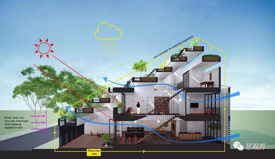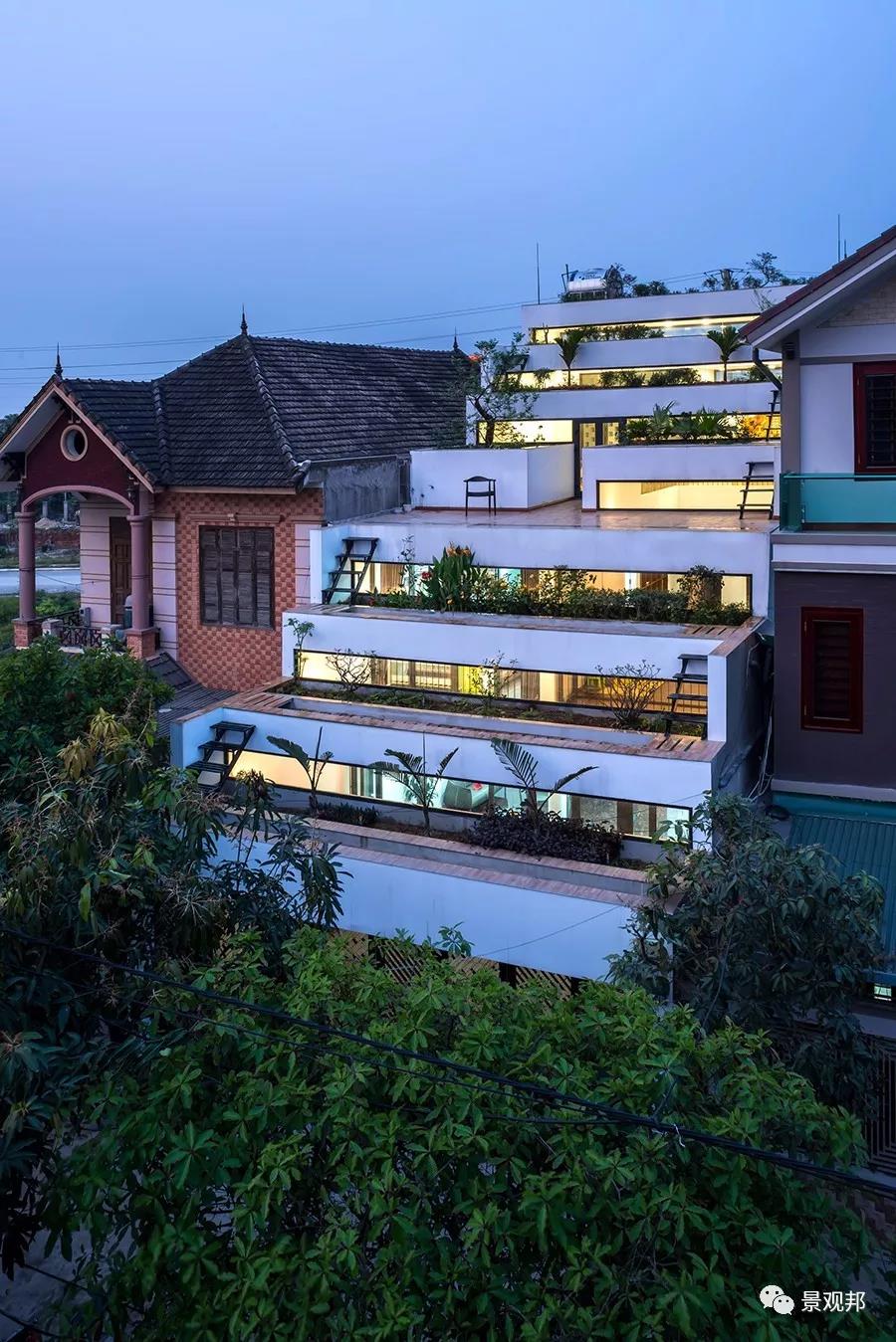 在“梯田之家”(Teraces Home)中,他們將越南鄉(xiāng)村生活的兩種基本元素結(jié)合在了一起:居住需求與農(nóng)耕傳統(tǒng)轉(zhuǎn)化為了水稻梯田造型的階梯式建筑。熱帶季風的天氣條件由坡頂?shù)膬蓚€灌溉系統(tǒng)進行調(diào)節(jié),從而讓這里草木長青。