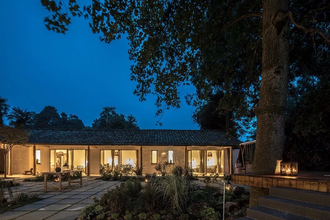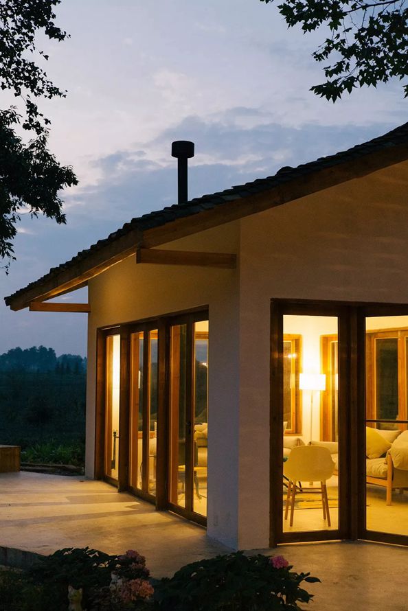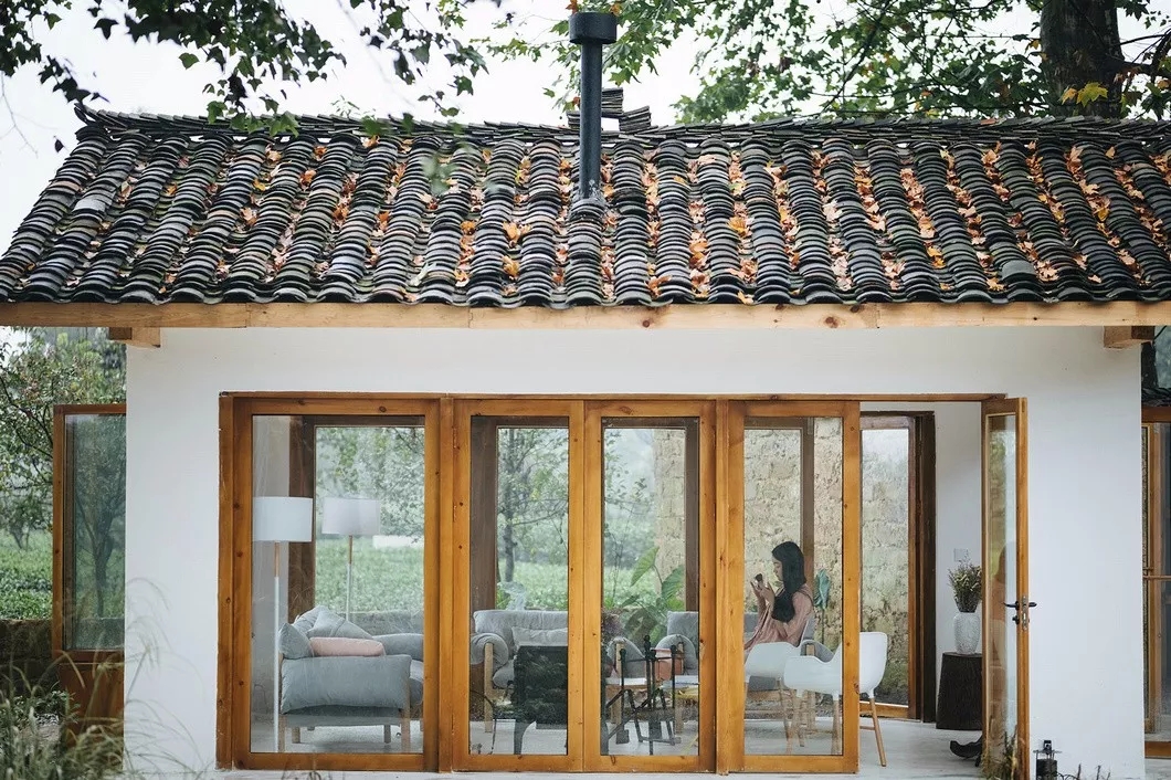 在院落的一角設(shè)計師放置了一組“開門見田”的客廳,與主要功能區(qū)形成45度錯動。通過加建客廳圍合出一處三合院落,并延伸至茶田邊界。