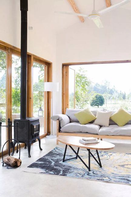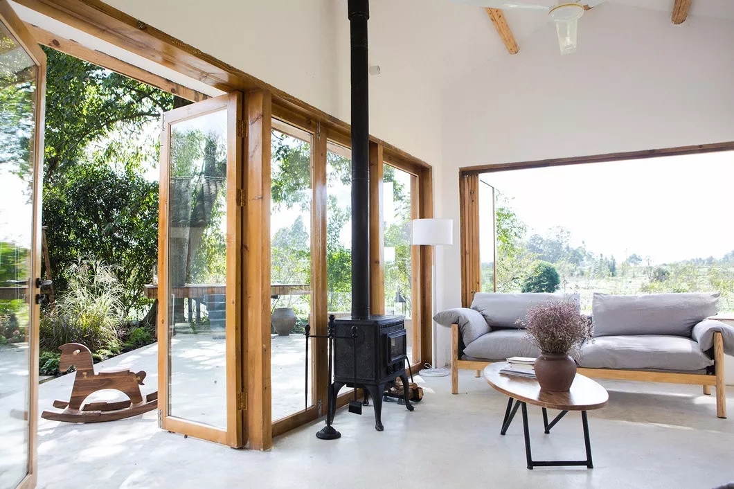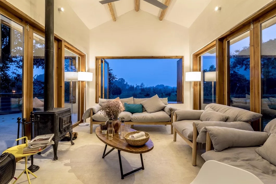 客廳,落地窗絕佳的采光設(shè)計,可推拉的窗戶設(shè)計,讓整個空間與自然相連,房間仿佛置身在茶園間,內(nèi)外都滿是綠色,從窗戶看出去仿佛就像掛在墻上的一幅田間畫卷。