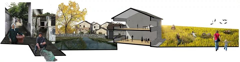 計(jì)家大院基地在計(jì)家墩村北部,可由村里主路直達(dá)?;啬蟼?cè)是一片開闊的水域,北側(cè)是一片香樟林,隔著香樟林就是大片的農(nóng)田?;貎?nèi)現(xiàn)存八棟舊房,但現(xiàn)存樓房從尺度和結(jié)構(gòu)上都不太能適應(yīng)新功能的需要,故而采取了整體新建的策略。