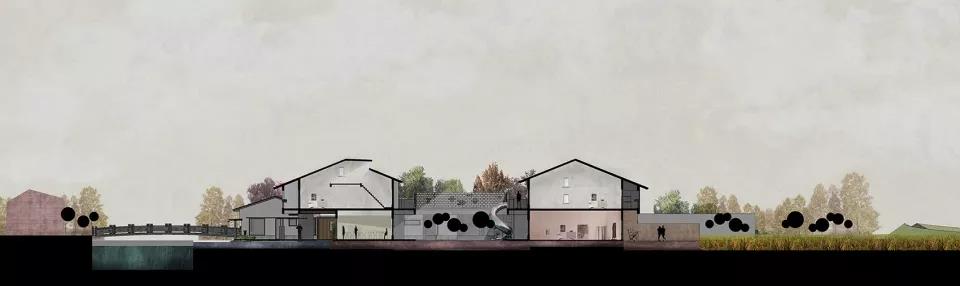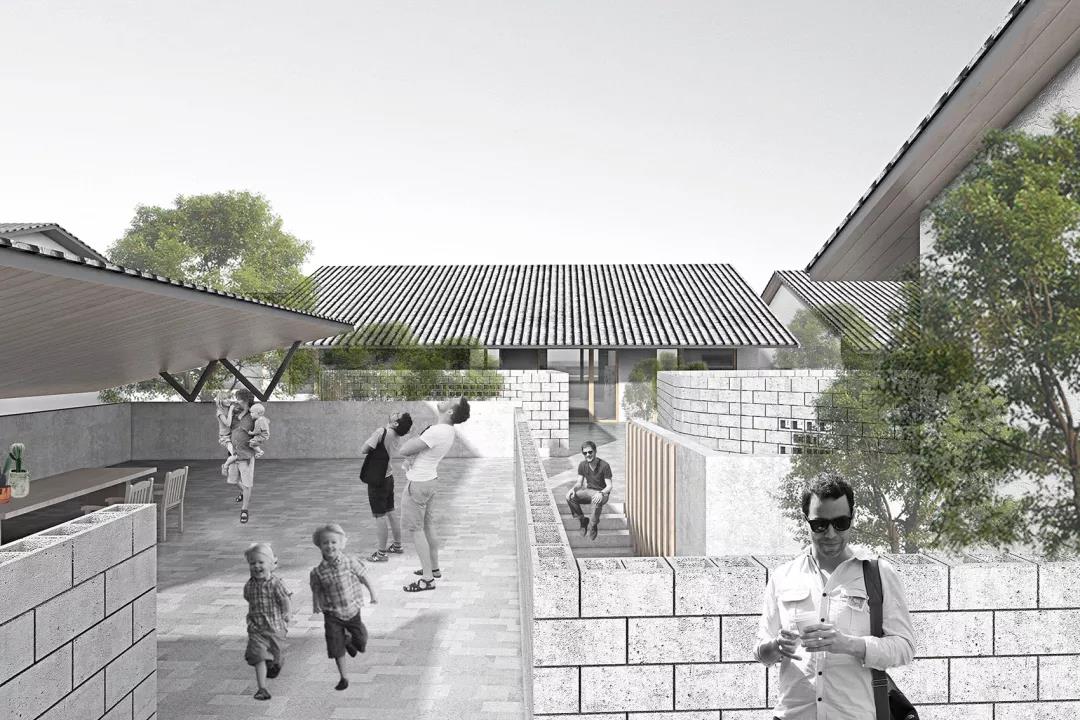 新建筑在位置布局上只是在原有建筑位置上做微調(diào),并借鑒原有建筑的空間尺度,比如窄巷的尺度,它不寬反而給巷里相遇的人以駐足乃至從容交談的可能。民居建筑經(jīng)過世代人的居住,積累下來的不只是實(shí)用,適宜的空間尺度,也有鄰里之間的人情味。窄巷,流水小橋,田野,門庭小徑;垂釣碧溪邊,影斜田埂上的種種是我們不想忘記的美好。在這里建房子,不需要設(shè)計(jì)過多的介入,因?yàn)檫@里原本的生活足夠吸引人。建筑創(chuàng)作也回歸到樸素的本原,鄉(xiāng)土的建造,材料的因地制宜,與自然環(huán)境和諧共生,并充分利用自然資源解決建筑需要面對(duì)的問題。本次設(shè)計(jì)的出發(fā)點(diǎn)是在新建的基礎(chǔ)上之保留村里原有房屋的一些空間尺度和風(fēng)貌肌理,如樓棟之間的窄巷。設(shè)計(jì)過程中,建筑師對(duì)空間做了適應(yīng)性的調(diào)整和梳理。建筑位置在原有基礎(chǔ)上微調(diào)。原有的建筑形式使得每家每戶都有獨(dú)立院落,但是缺乏互相交流的空間,故本次設(shè)計(jì)拓寬了房屋之間的前后間距,使其形成一個(gè)中央公共空間,將每戶的私人庭院移至南北兩端。南側(cè)共布置有一大一小的兩棟樓,且在布局上有一個(gè)角度旋轉(zhuǎn)的處理,從而改善從村里主道行進(jìn)過程中對(duì)建筑整體形象和尺度的感知,也削弱了建筑對(duì)行走在河岸小道行人的壓迫感。北側(cè)面向田野布置四棟兩層高的建筑,這樣,底層住戶享有各自的私有庭院的同時(shí)二層住戶也能最大限度的享受一望無際的田野景觀。