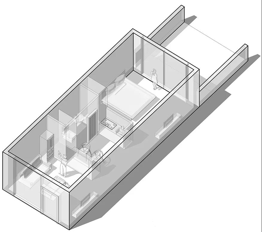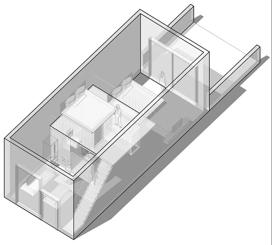 在功能分布上,項(xiàng)目的公共及輔助設(shè)施被安排在臨近入口的單層建筑中。北側(cè)靠中心庭院的樓棟二層為公共客廳,是項(xiàng)目最大的公共空間。項(xiàng)目中的單層建筑為獨(dú)棟居所,首層每套住房都帶有30平及以上面積的庭院,二層房間分為復(fù)式和單層凈高較大的房間,租戶可根據(jù)自身的喜好來靈活選擇不同類型的居住空間。
