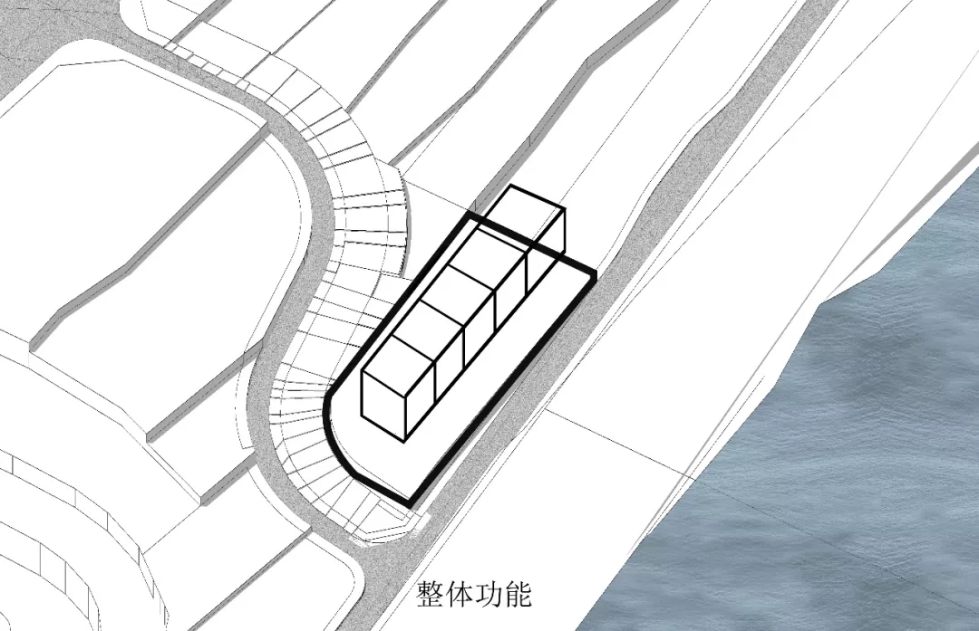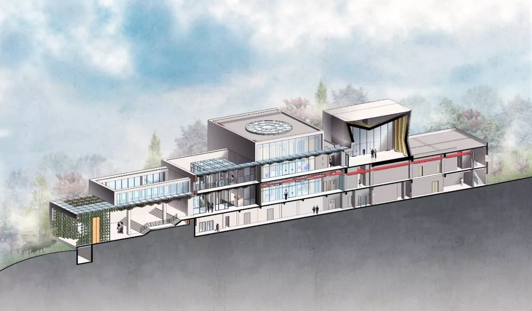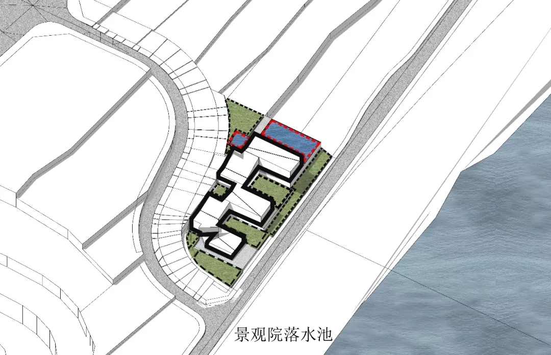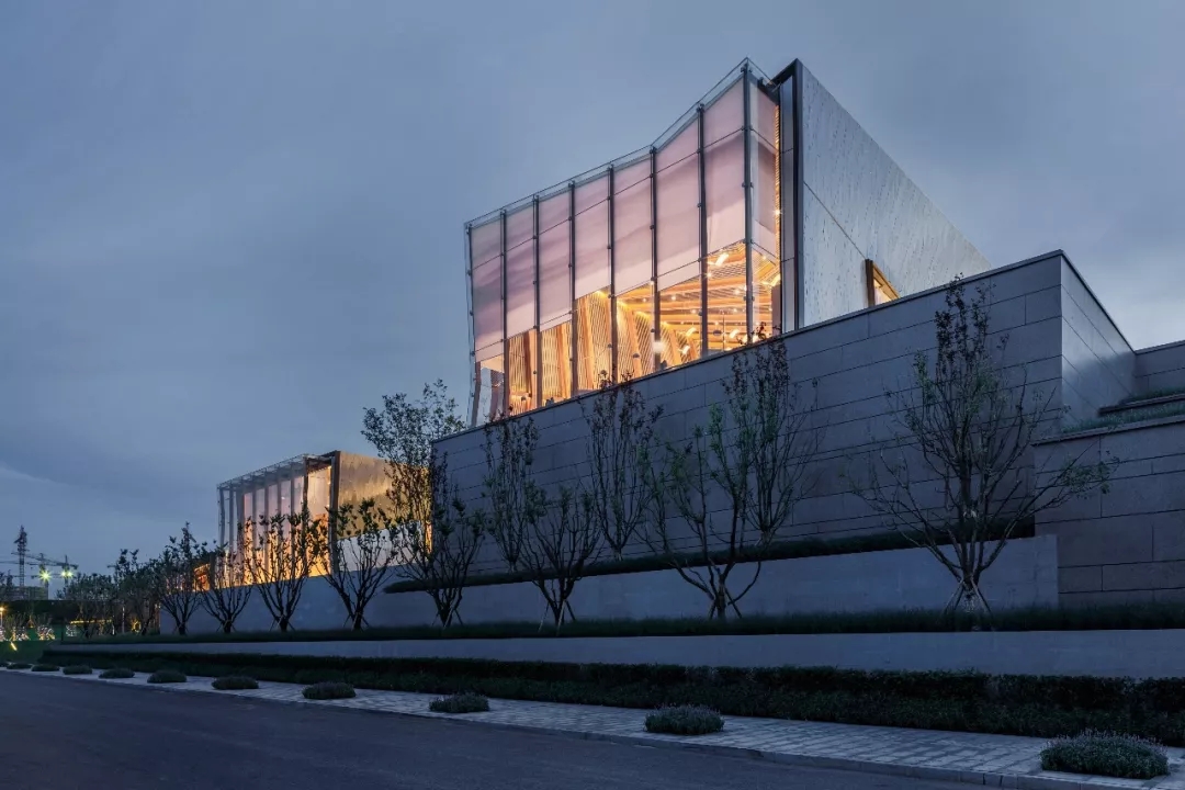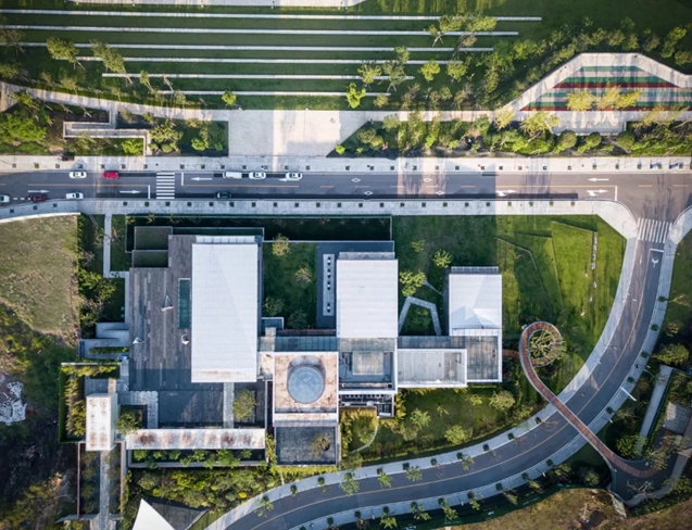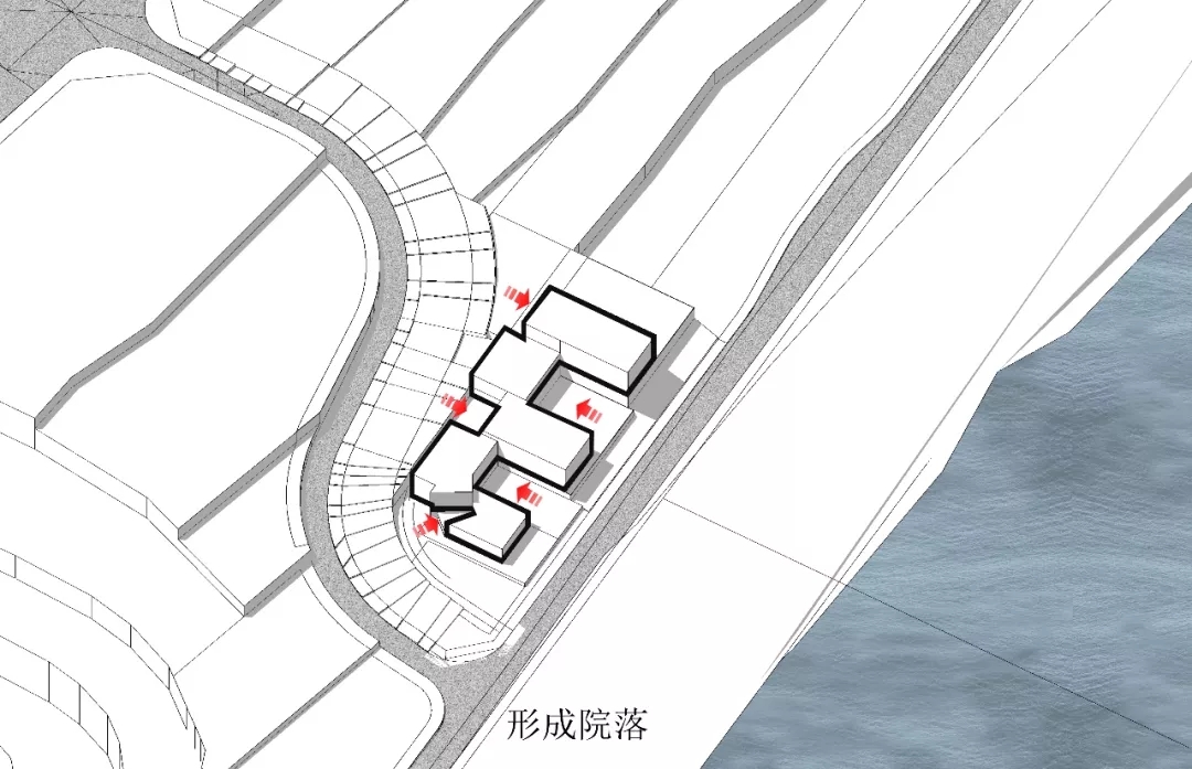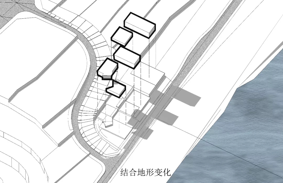 作為對環境的回應,建筑師將三個體量不同的盒子并列于山坡上,垂直于濱河道路,以期達到濱河景觀及遠山的最佳觀賞。通過建筑與環境的互塑共生,使遠山、河流、庭院、建筑重塑構成新的秩序,營造獨有坡地特征的建筑群落。