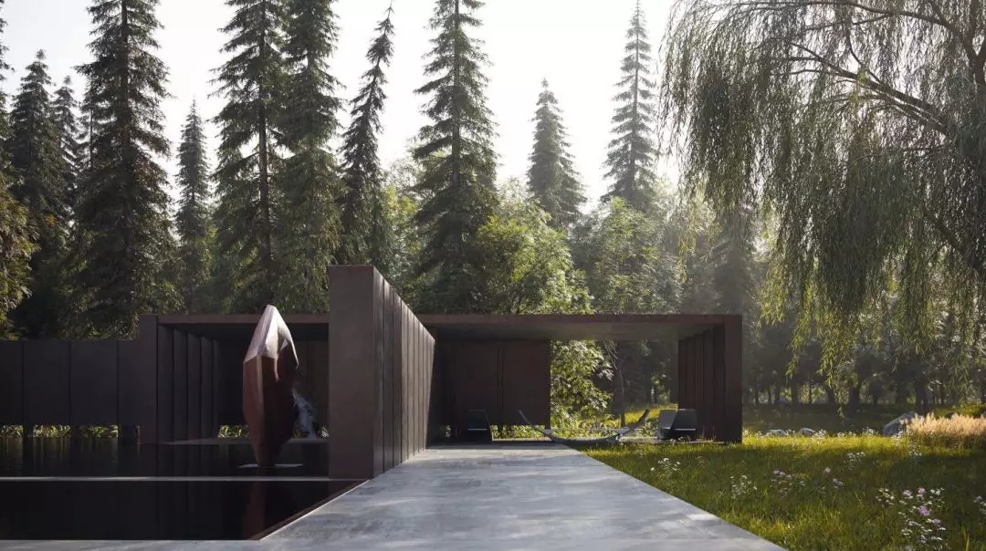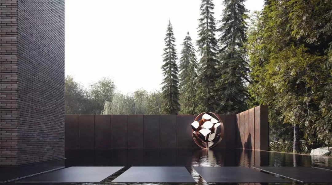 建筑師還設計了一個人造水池,使水成為了與混凝土,玻璃和鋼材同樣重要的材料。位于游泳池的雕像是烏克蘭藝術家納扎爾·貝利克創造的“雨”。