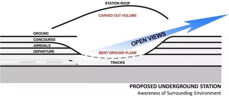 Andrew Bromberg對于該車站的設計為場地引入超過3公頃的“綠色廣場”。外側的地面層朝入口向下彎曲,而上方的屋頂結構指向天空。由此打造出一個45米挑高的空間,將聚焦點集中于南立面,望向香港中環的天際線和太平山頂及遠處。