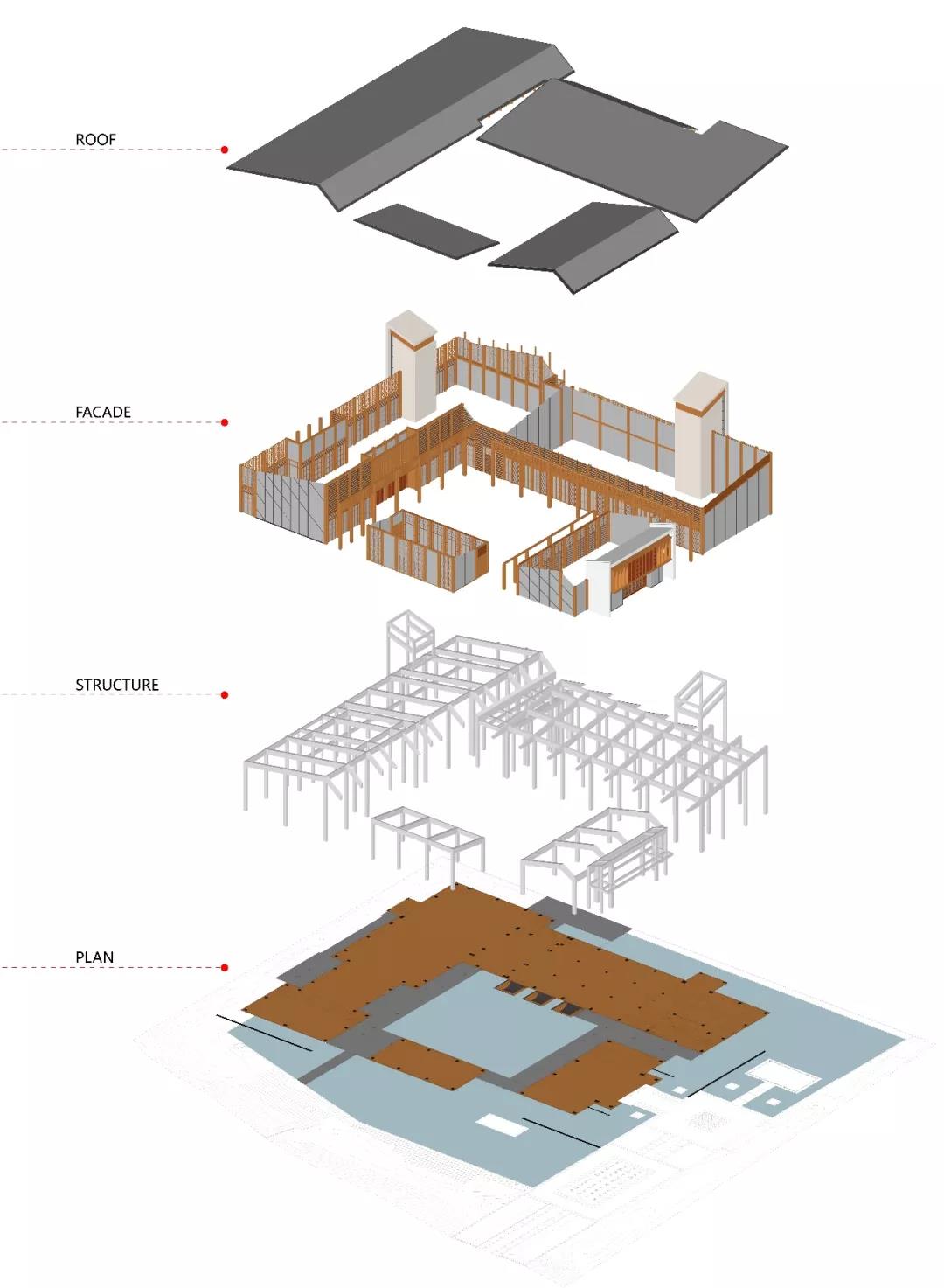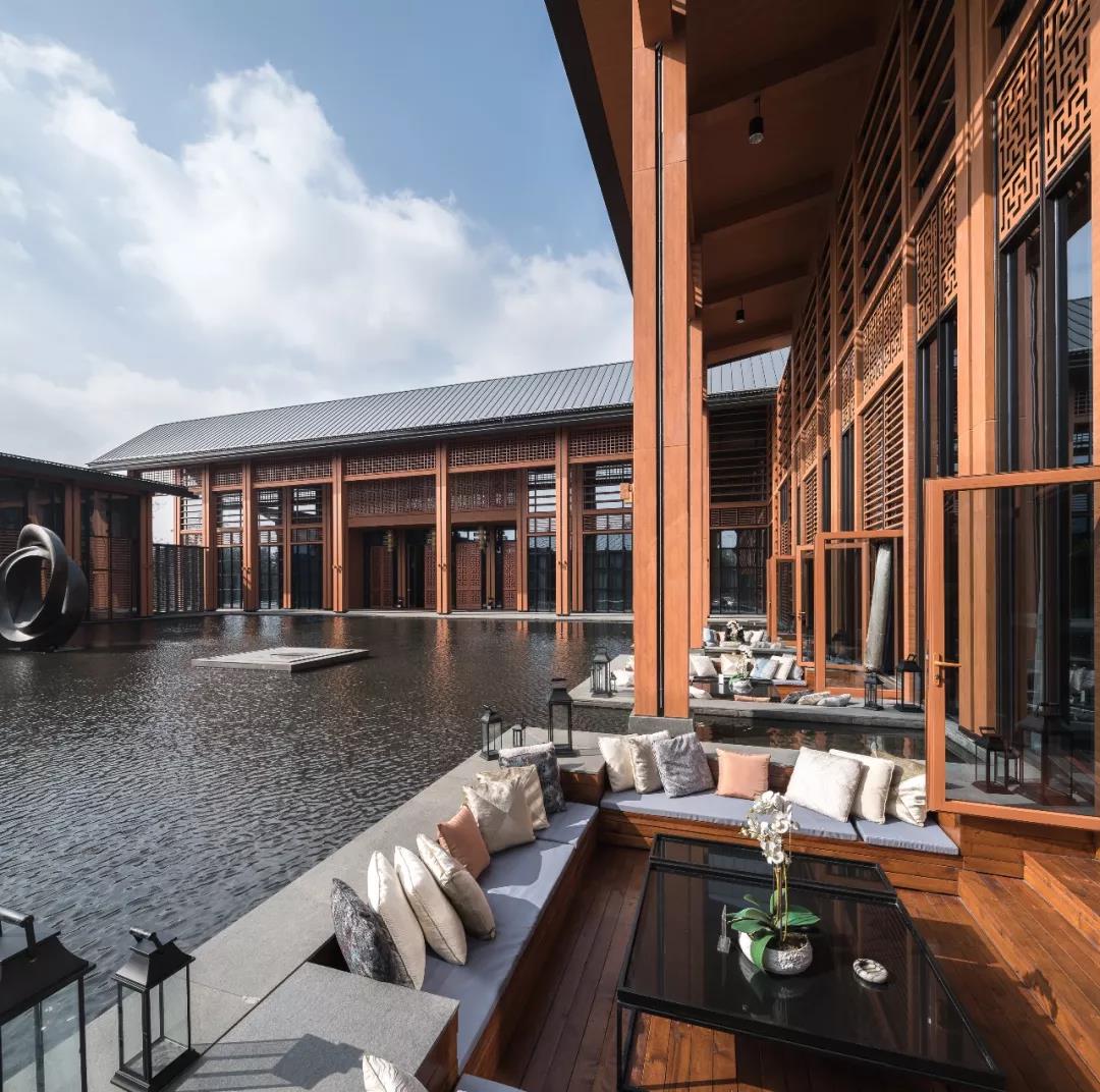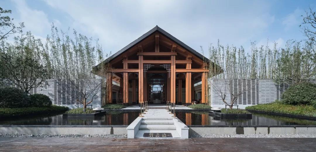 建筑傳承了徽派建筑四水歸堂的空間布局,以水為脈、以街為綱、以院為理,通過建筑體塊穿插錯動、屋頂的轉折、植物景觀的營造,形成“園”-“墻”-“廊”-“廳”的空間形式,園中有屋,屋中有院,以質樸、自然的姿態表達了一種委婉含蓄的詩情。