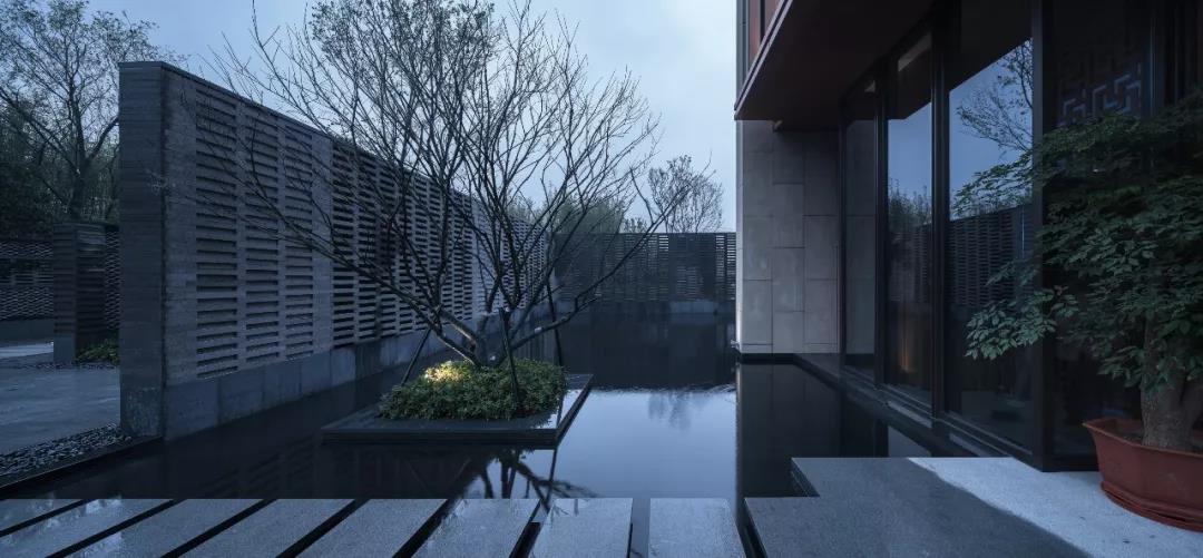 入口門廳處,院墻與建筑圍合形成水院,樹木點綴其間,漫步于親水的石階,似漂浮水面之上,水的柔美和建筑剛硬的線條碰撞,渾然天成,別有風致,使得建筑有靜謐脫俗之感。
