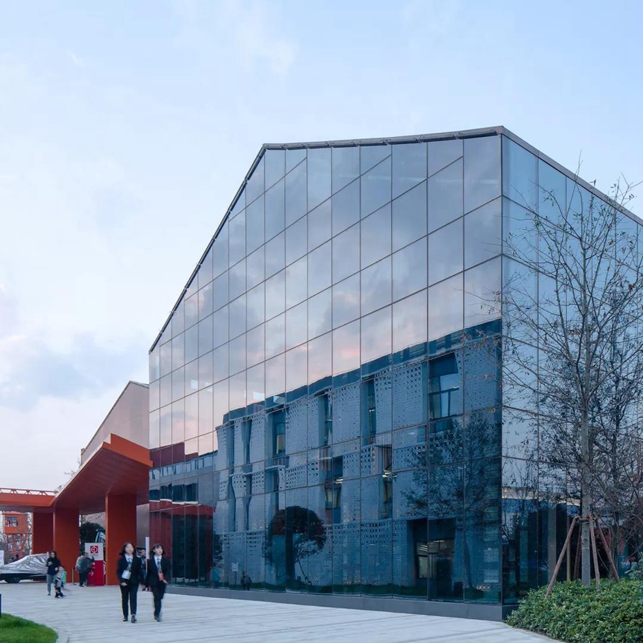 不同于原有廠房所訴求工業屬性的遺存,新建廠房的創造更注重尋求形意的表達。衍變自良渚文化的典型器物玉琮,取自其橫向線條和轉折關系,解構重建賦予立面,起到不同的遮陽作用。同時,用粗細變化的彩釉玻璃,營造建筑立面的光澤變化,表現建筑如玉般細膩的質感,展示良渚古老的文化歷史。