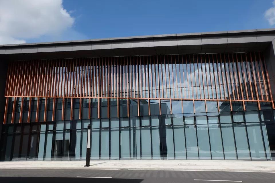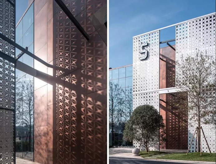 建機場項目隨處可見橙色與純白形成的視覺沖擊,呼應龍門吊的原生色彩。新建外墻面則采用耐候鋼板,以其鐵銹質感與歷史貼合。大型辦公建筑外圍立面鋪設鋁合金穿孔板遮陽百葉,現代化的光孔形態使得立面在不同時段的陽光下都享有豐富的變化。