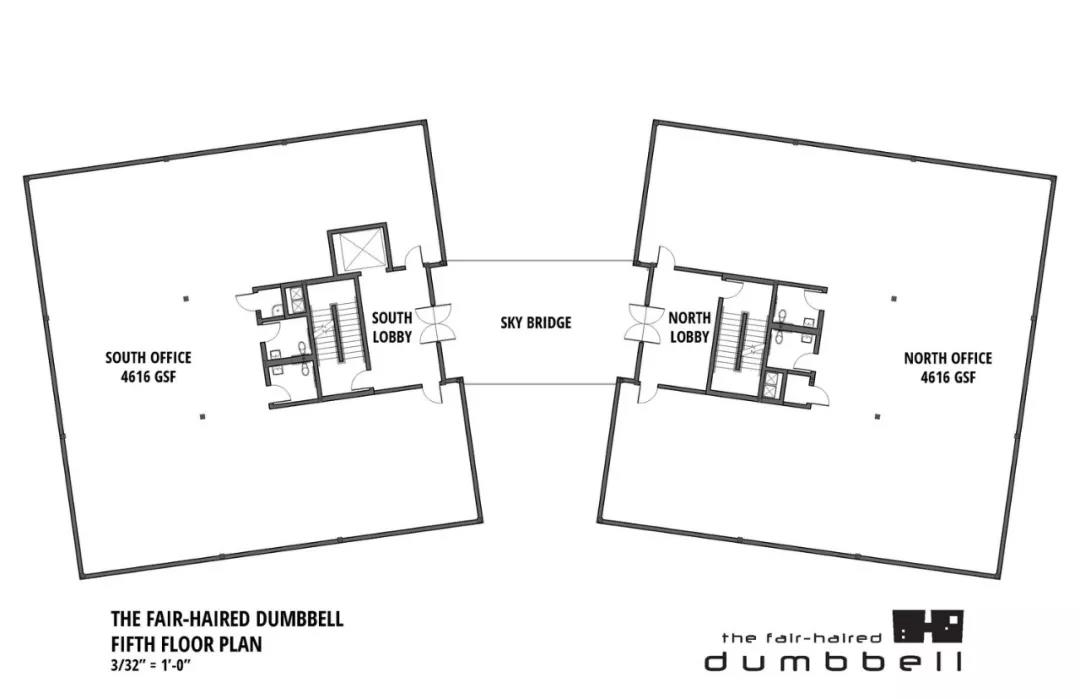 這個大廈的起點是一個充滿挑戰的小“島嶼”,周圍都是繁忙的街道。為了最大化該區域的可用空間,設計團隊將小型相互連接的公共廣場納入一樓的零售區,歡迎行人在室內行走休息。金發啞鈴大廈正好坐落在活動的中心,也是人們注意力的中心。