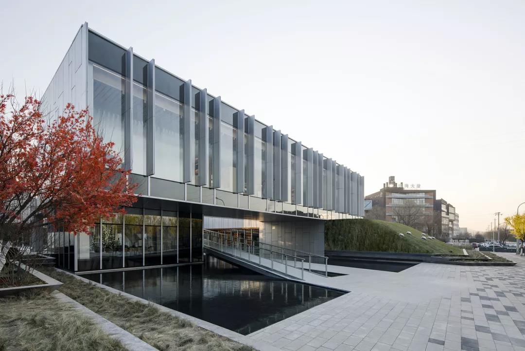 隨著一天中光線的變化,光相當(dāng)于作為一種獨立的材質(zhì)參與到建筑中。鋁板隨著陽光的強(qiáng)度變化呈現(xiàn)出不同的色調(diào),玻璃的色調(diào)則是同時具備了天空的顏色和內(nèi)部的光照,平靜的水面再將建筑和天空一同納入其中,層疊反復(fù)的光影反射讓建筑的邊緣和界限模糊起來,也為建筑呈現(xiàn)出更豐富多變的面貌。夕陽西下時分,從二層平臺的花園向西望去,溫暖的余暉直透過兩層玻璃幕墻,如“框景”一般勾勒出西側(cè)公園景觀和遠(yuǎn)方西山的輪廓,玻璃退讓為光線的畫布,室內(nèi)的場景與活動展示于畫布之上,上演了有趣的看與被看的空間敘事關(guān)系。