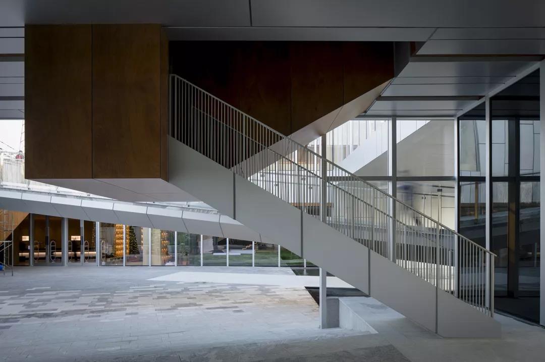 如果說建筑自身風(fēng)格與形式方面的“自由”只是詮釋了自由的一個方面,那么建筑師在設(shè)計中無疑試圖表達(dá)了更多。建筑主體方正、沉穩(wěn)的體量與西側(cè)那一條充滿力量感和動感的坡道的組合,庭院里幾何分割棱角分明的臺階、水景與延續(xù)了南側(cè)整個立面自然態(tài)的草坡的對比和融合,作為主材質(zhì)的玻璃和鋁板清冷、堅硬的質(zhì)感對多處點綴的Parklex木紋板溫暖而親近自然的柔和感的襯托,無一不在喻示著本身的矛盾性和復(fù)雜性。正如羅伯特·文丘里所說,現(xiàn)代建筑往往是以犧牲多樣而復(fù)雜的東西為代價,來將建筑中原始而基本的東西理想化,因此在面對更復(fù)雜、變化更快的世界時會變得軟弱而無力。而能深刻有力地滿足人們心靈需求的美,都是來自內(nèi)在的復(fù)雜性。