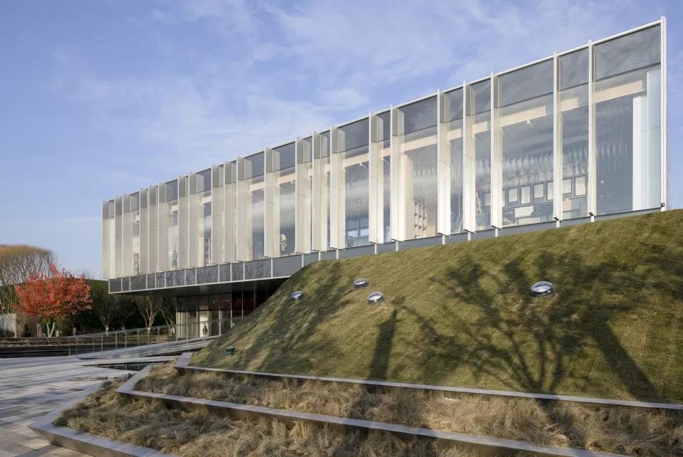 建筑位于草坡上,鋁板立面和環(huán)境相和諧