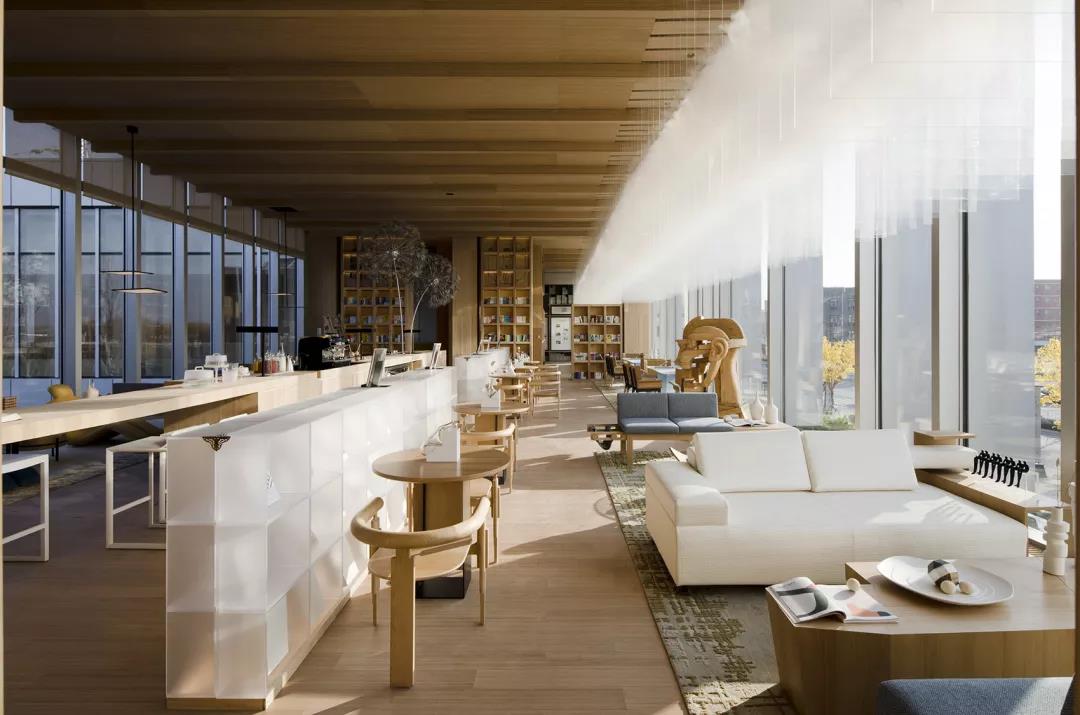 建筑主體由淺灰色鋁板,配合超白玻為作為主立面效果,局部添加Parklex木板作為點綴。玻璃本身具有的隨光線變化的通透性和反射性,配合鋁板的漫反射對周邊環(huán)境也形成了深淺不一的反射效果,形成了建筑對自然環(huán)境主觀的反映和融入,從另一方面達(dá)成“與自然對話”的設(shè)計主題。