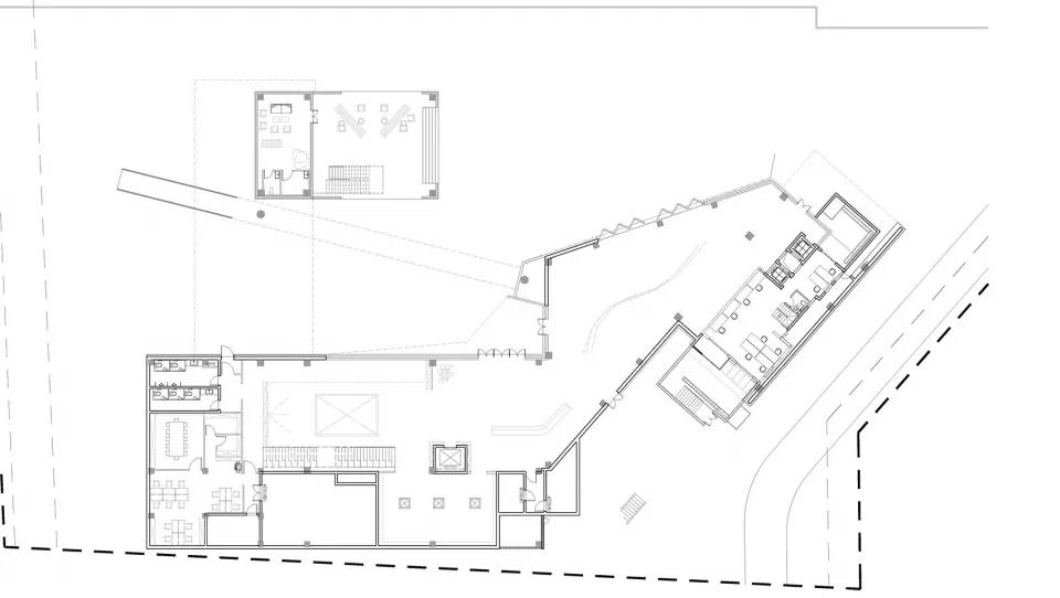 除了建筑自身的“自由”之外,建筑師希望建筑對于城市環(huán)境的關(guān)系也同樣是“自由”的,因此在西側(cè)主入口打造了一個完全開敞的、可穿過的底層架空空間,而在場地內(nèi)部營造了界限模糊的“院落”。建筑師認(rèn)為,“院落”的界定不應(yīng)拘泥于固定的格式,因此嘗試了以一條半懸空的坡道對內(nèi)外庭院進(jìn)行模糊劃分,從空間的曖昧關(guān)系上繼續(xù)呼應(yīng)“自由”的設(shè)計理念。