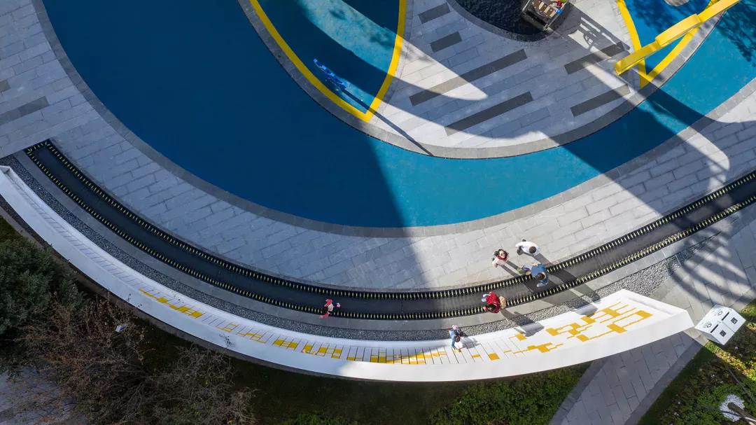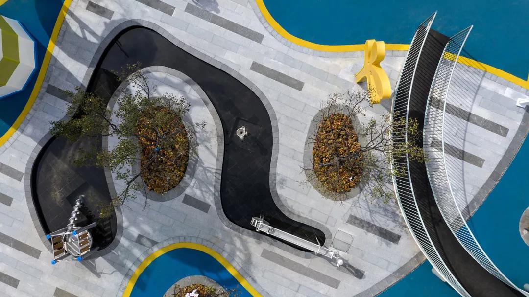 橢圓和自由曲線形成功能性的綜合場地。藍色與******的EPDM塑膠地墊拼貼組合,形成幾何化場地,容納安放趣味和想象。