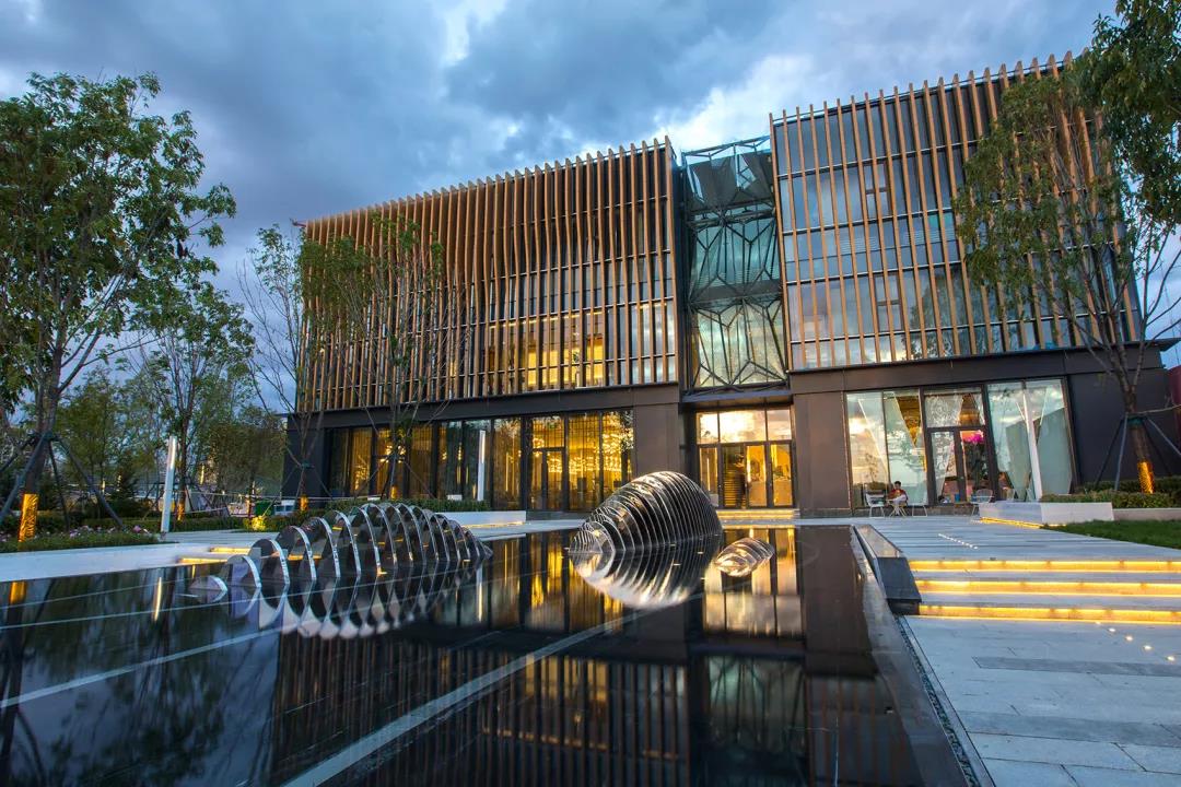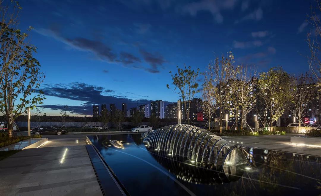 銷售中心前的“鯨群”雕塑,巧妙展現出“鯨奇谷地”的不同意趣。夏季水池蓄滿,鏡面水景反射出群魚的躍動,冬季水落石出,層層階梯顯露出對山林谷地的回應。