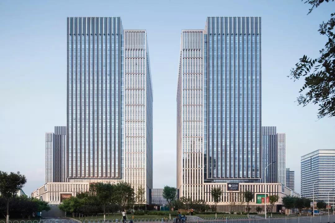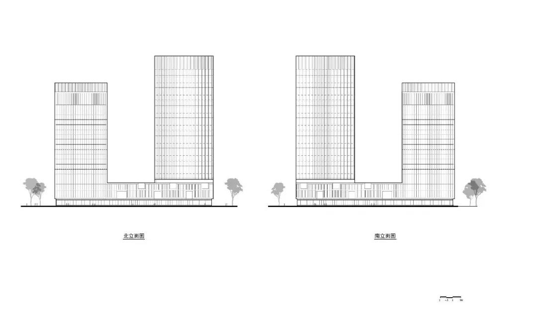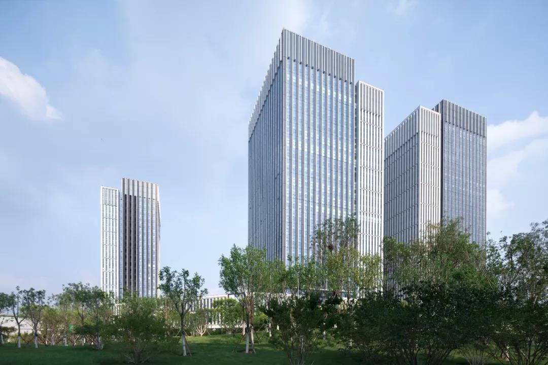 建筑師在建造前需要充分的考慮與周邊環(huán)境、建筑群的共融共生,實(shí)現(xiàn)整體的統(tǒng)一觀感,在此基礎(chǔ)上充分考慮環(huán)保節(jié)能。為充分利用基地面積,將地塊角落部分隔出用作綠化及停車空間,在中心位置的2棟高檔高層辦公建筑,使其形成標(biāo)志性的雙塔形狀,配合兩端2棟稍矮辦公建筑作為輔助,圍合成一個(gè)由裙房屋頂綠化,半圓形廣場(chǎng)組成的綠意融融的空間,并使得4棟塔樓保持適當(dāng)?shù)拈g距距離而避免過于擁擠。
