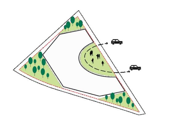 為了減少對(duì)基地對(duì)周邊交通的影響,適當(dāng)設(shè)置基地的出入口,最小化出入口的數(shù)量。首先在基地東側(cè)設(shè)置規(guī)劃道路,溝通阜盛道和萬卉道,將主要入口置于規(guī)劃道路上,以此減少在城市干道上的開口。此外于基地西北側(cè)沿高鐵綠化帶設(shè)置車行路溝通萬卉道和規(guī)劃道路,并于建筑主體西南轉(zhuǎn)角處向萬卉道開設(shè)出入口。如此,形成萬卉道上3個(gè)、阜盛道上1個(gè)共4個(gè)面向城市主干道的主要出入口。