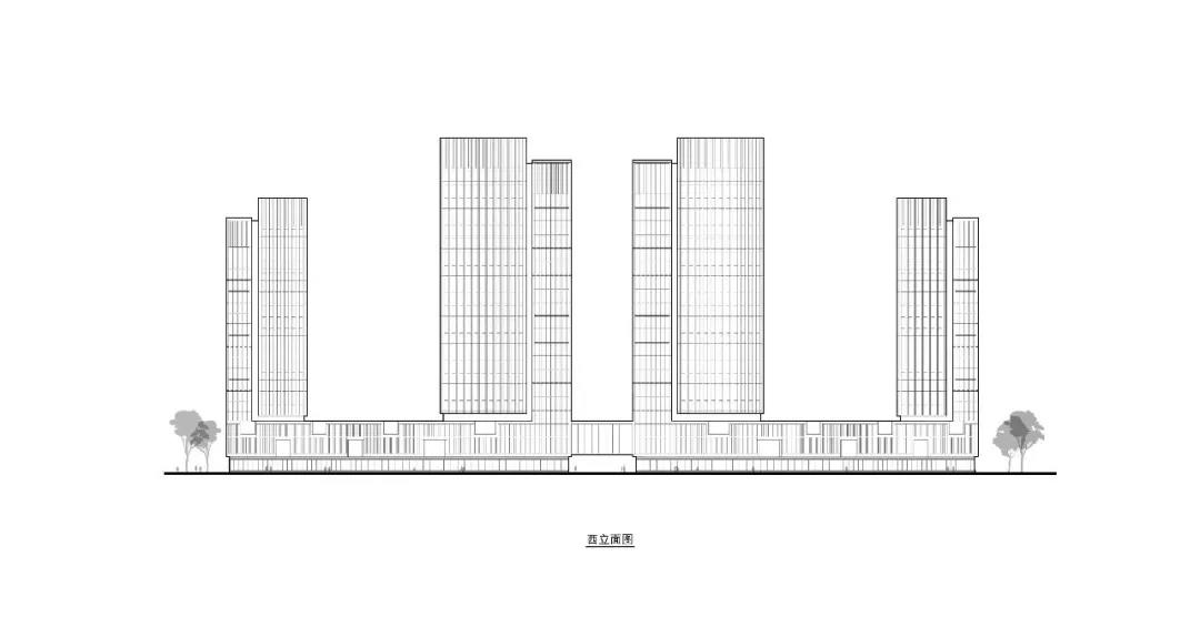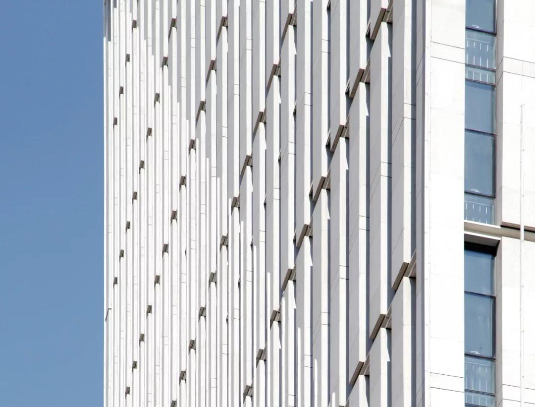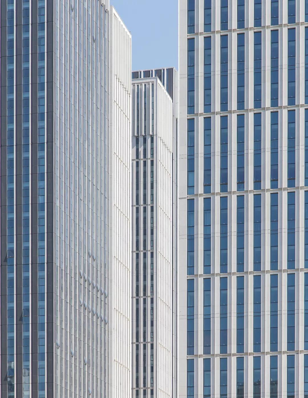 原本的建筑塔樓體量較敦實(shí),設(shè)計(jì)師在新城市中心使用了玻璃幕墻,調(diào)整了整個(gè)百葉窗的位置和間距,通過增加鋁板大百葉窗,使得整個(gè)主體幕墻和實(shí)墻之間的比例擴(kuò)大,產(chǎn)生一種明顯的虛實(shí)對(duì)比效果,從視覺上優(yōu)化了建筑的視覺效果,從視覺上將建筑分為兩個(gè)體塊,重新組合出了輕盈的體量關(guān)系,這種強(qiáng)烈的虛實(shí)變化使得建筑顯得高挑挺拔,整體感更加強(qiáng)烈、鮮明,玻璃立面使得商業(yè)裙房的商業(yè)價(jià)值最大化,同時(shí)和商業(yè)裙房連接為一個(gè)有機(jī)的整體。