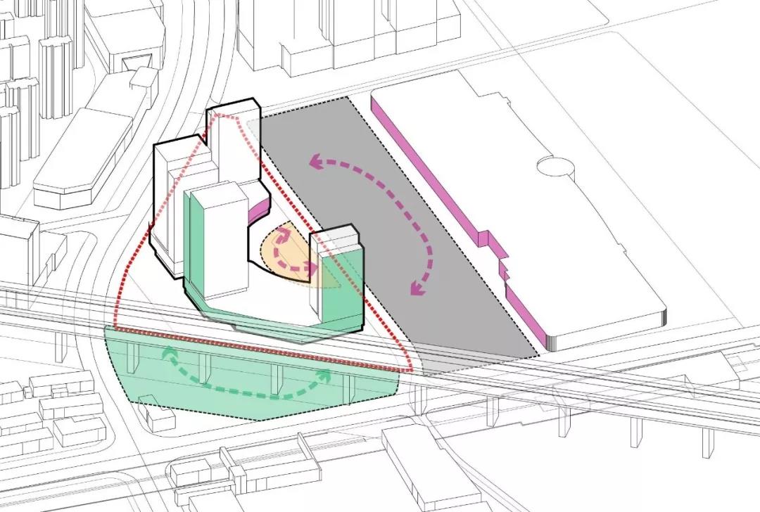 主要人行流線有沿建筑外緣的人行步道和中心半圓廣場(chǎng),廣場(chǎng)部分商業(yè)部分人流集散起主要作用,同時(shí)和東側(cè)永旺商業(yè)形成互補(bǔ)。建筑外緣人行步道分別設(shè)置出入口直接進(jìn)入辦公塔樓內(nèi),以及商業(yè)輔助出入口。