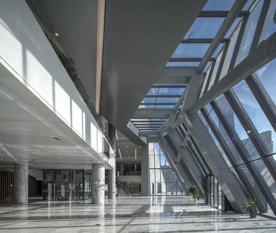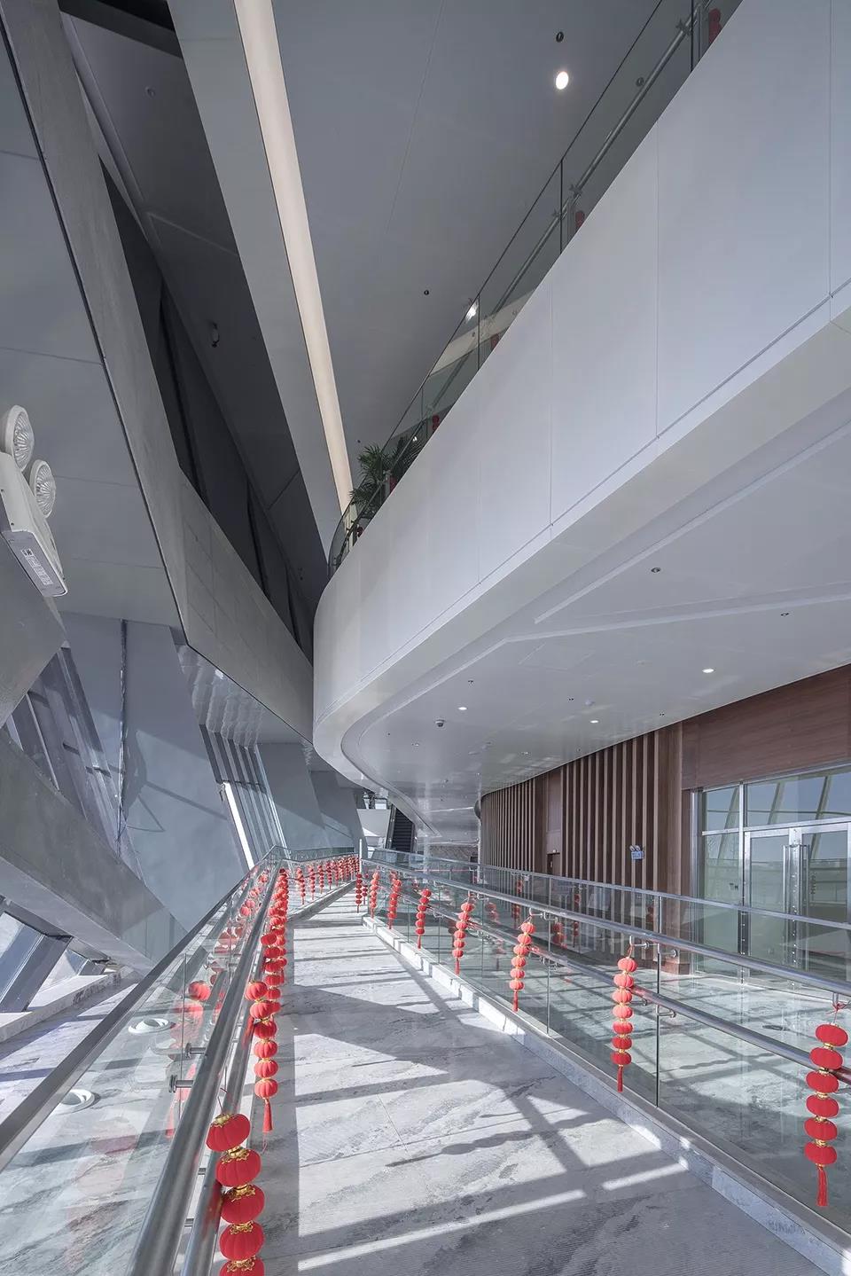 圖書館總建筑面積31322㎡。傾斜的形體形成面向江面景觀跌級(jí)的閱覽空間,檢索大廳上空互相穿插的廊道形成戲劇化的建筑空間。圖書館外墻采用局部文字紋樣1m*3m的混凝土板,文字內(nèi)容摘自《荀子·勸學(xué)篇》的勵(lì)志古訓(xùn),彰顯圖書館作為傳播知識(shí)的載體特征。